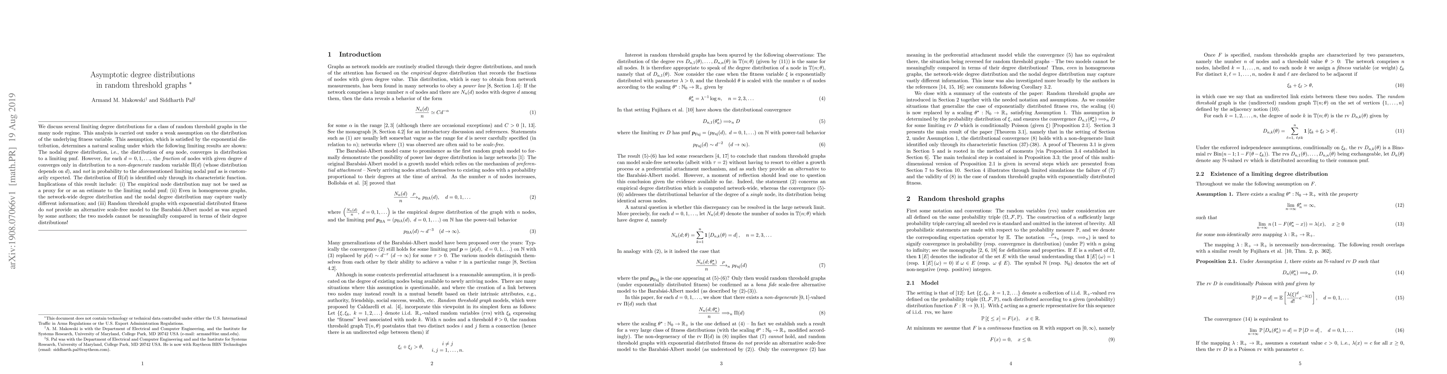We discuss several limiting degree distributions for a class of random threshold graphs in the many node regime. This analysis is carried out under a weak assumption on the distribution of the underlying fitness variable. This assumption, which is satisfied by the exponential distribution, determines a natural scaling under which the following limiting results are shown: The nodal degree distribution, i.e., the distribution of any node, converges in distribution to a limiting pmf. However, for each $d=0,1, \ldots $, the fraction of nodes with given degree $d$ converges only in distribution to a non-degenerate random variable $\Pi(d)$ (whose distribution depends on $d$),and not in probability to the aforementioned limiting nodal pmf as is customarily expected. The distribution of $\Pi(d)$ is identified only through its characteristic function. Implications of this result include: (i) The empirical node distribution may not be used as a proxy for or as an estimate to the limiting nodal pmf; (ii) Even in homogeneous graphs, the network-wide degree distribution and the nodal degree distribution may capture vastly different information; and (iii) Random threshold graphs with exponential distributed fitness do not provide an alternative scale-free model to the Barab\'asi-Albert model as was argued by some authors; the two models cannot be meaningfully compared in terms of their degree distributions!