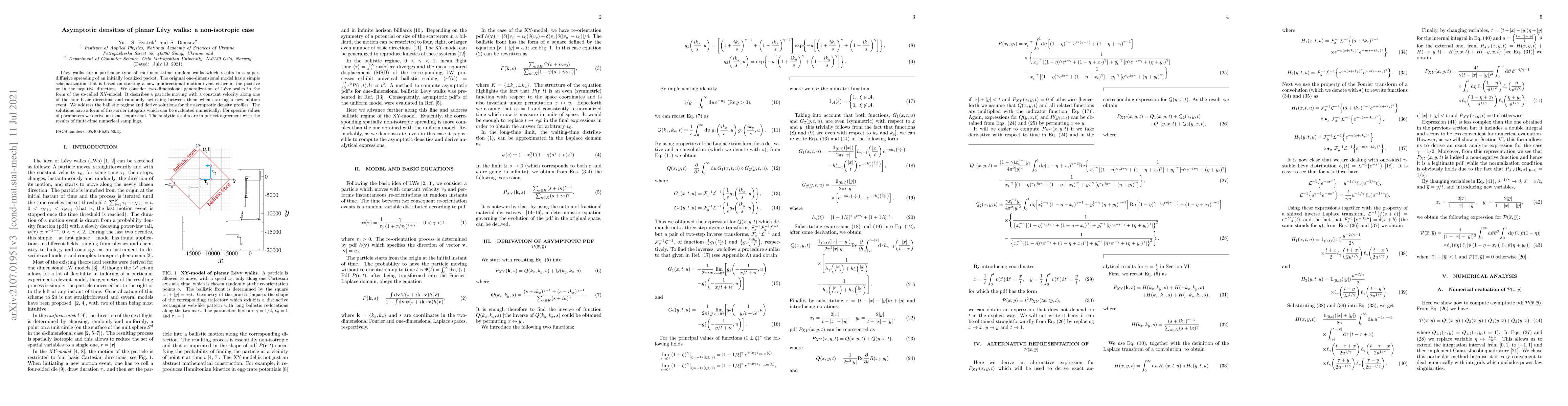 This paper explores the asymptotic densities of two-dimensional Lévy walks in the non-isotropic XY-model, deriving solutions for the ballistic regime and comparing them with numerical simulations. The derived first-order integral solutions are shown to match exact expressions for specific parameter values.