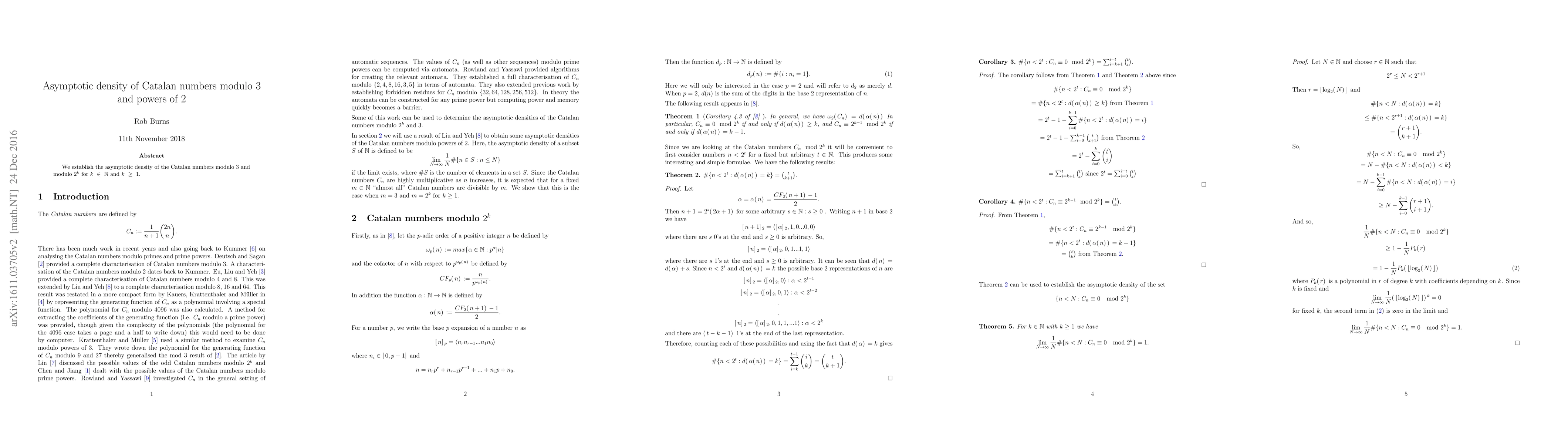 This paper investigates the asymptotic density of Catalan numbers when taken modulo 3 and higher powers of 2, providing a detailed analysis of their distribution patterns. The findings contribute to the understanding of number theory within combinatorial sequences.
