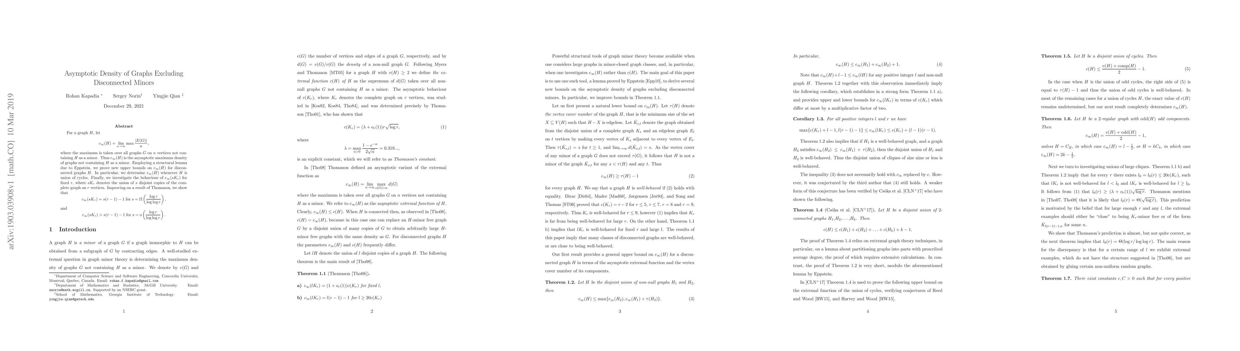 This research paper presents new upper bounds for the asymptotic maximum density (c_∞(H)) of graphs not containing a disconnected minor H. Utilizing Eppstein's structural lemma, the authors determine c_∞(H) when H is a union of cycles. Furthermore, they study c_∞(sK_r), the density of graphs avoiding s disjoint complete graphs on r vertices, improving upon previous results by Thomason. They show c_∞(sK_r) = s(r-1) - 1 for s = Ω(log r / log(log r)) and c_∞(sK_r) > s(r-1) - 1 for s = o(log r / log(log r)).