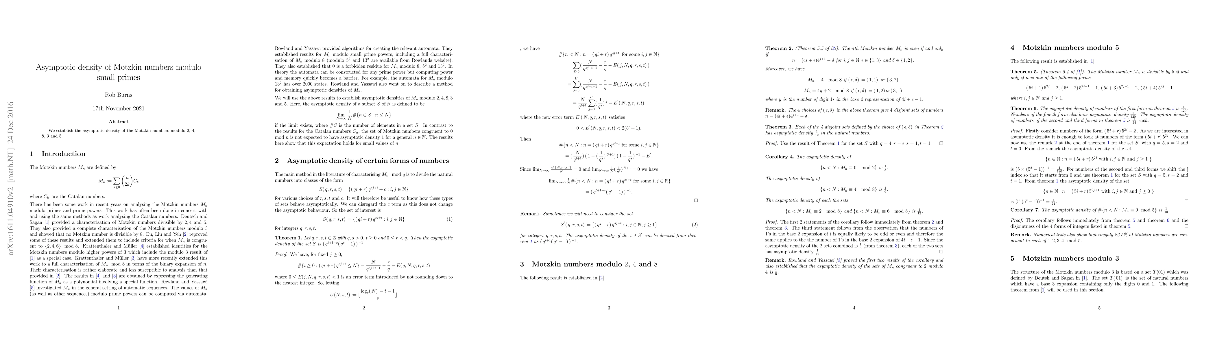 This study establishes the asymptotic density of Motzkin numbers when taken modulo small primes, providing insights into their distributional properties. The findings contribute to understanding the combinatorial behavior of these numbers under prime modulus conditions.