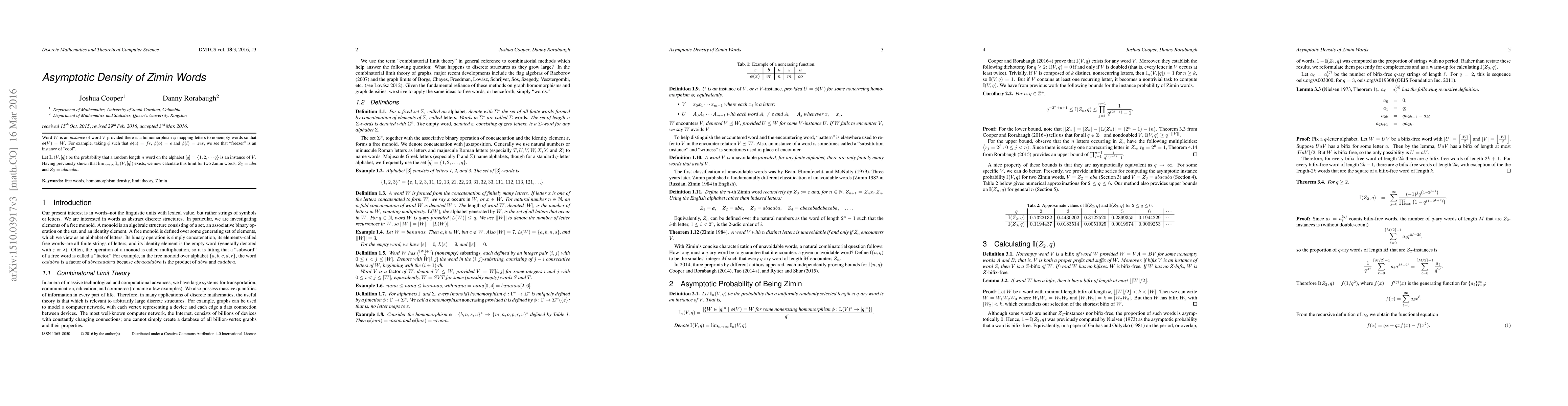This paper calculates the asymptotic density of Zimin words, specifically determining the limit of the probability that a random length $n$ word is an instance of Zimin words $Z_2 = aba$ and $Z_3 = abacaba$ as $n$ approaches infinity. The results extend previous findings on the existence of such limits.