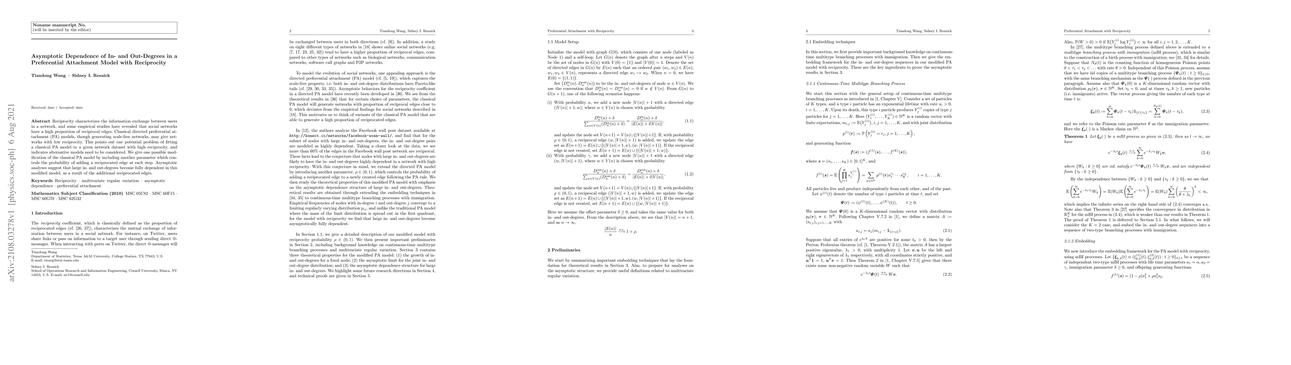 Reciprocity characterizes the information exchange between users in a network, and some empirical studies have revealed that social networks have a high proportion of reciprocal edges. Classical directed preferential attachment (PA) models, though generating scale-free networks, may give networks with low reciprocity. This points out one potential problem of fitting a classical PA model to a given network dataset with high reciprocity, and indicates alternative models need to be considered. We give one possible modification of the classical PA model by including another parameter which controls the probability of adding a reciprocated edge at each step. Asymptotic analyses suggest that large in- and out-degrees become fully dependent in this modified model, as a result of the additional reciprocated edges.