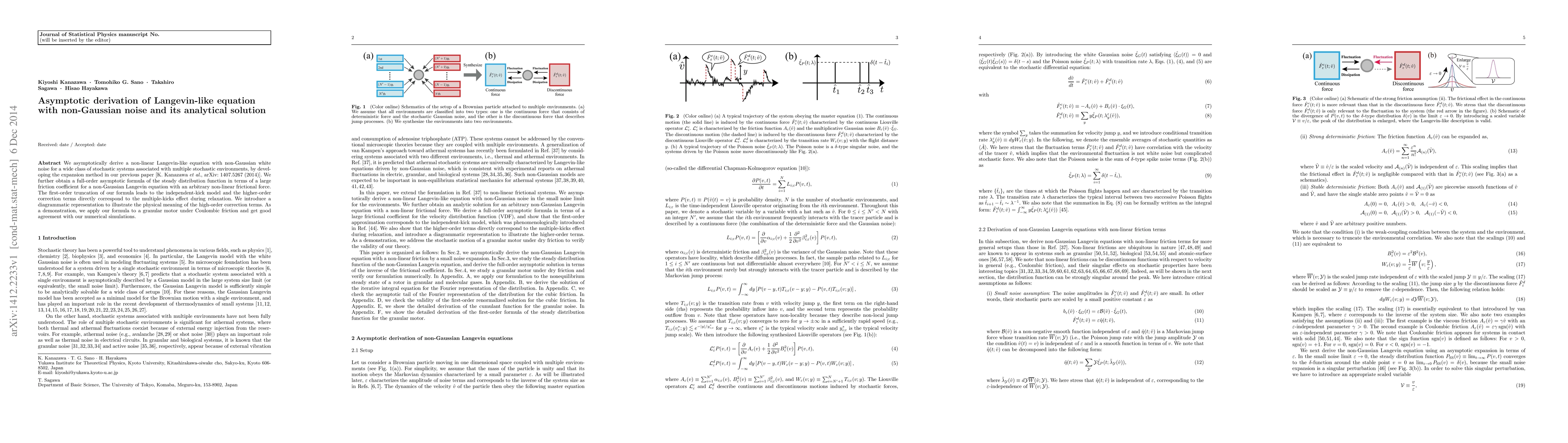 We asymptotically derive a non-linear Langevin-like equation with non-Gaussian white noise for a wide class of stochastic systems associated with multiple stochastic environments, by developing the expansion method in our previous paper [K. Kanazawa et al., arXiv: 1407.5267 (2014)]. We further obtain a full-order asymptotic formula of the steady distribution function in terms of a large friction coefficient for a non-Gaussian Langevin equation with an arbitrary non-linear frictional force. The first-order truncation of our formula leads to the independent-kick model and the higher-order correction terms directly correspond to the multiple-kicks effect during relaxation. We introduce a diagrammatic representation to illustrate the physical meaning of the high-order correction terms. As a demonstration, we apply our formula to a granular motor under Coulombic friction and get good agreement with our numerical simulations.