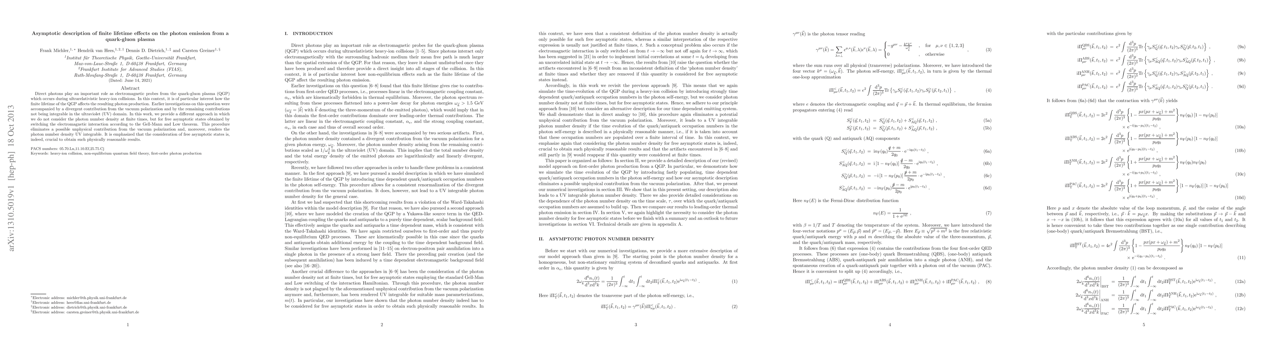 Direct photons play an important role as electromagnetic probes from the quark-gluon plasma (QGP) which occurs during ultrarelativistic heavy-ion collisions. In this context, it is of particular interest how the finite lifetime of the QGP affects the resulting photon production. Earlier investigations on this question were accompanied by a divergent contribution from the vacuum polarization and by the remaining contributions not being integrable in the ultraviolet (UV) domain. In this work, we provide a different approach in which we do not consider the photon number density at finite times, but for free asymptotic states obtained by switching the electromagnetic interaction according to the Gell-Mann and Low theorem. This procedure eliminates a possible unphysical contribution from the vacuum polarization and, moreover, renders the photon number density UV integrable. It is emphasized that the consideration of free asymptotic states is, indeed, crucial to obtain such physically reasonable results.