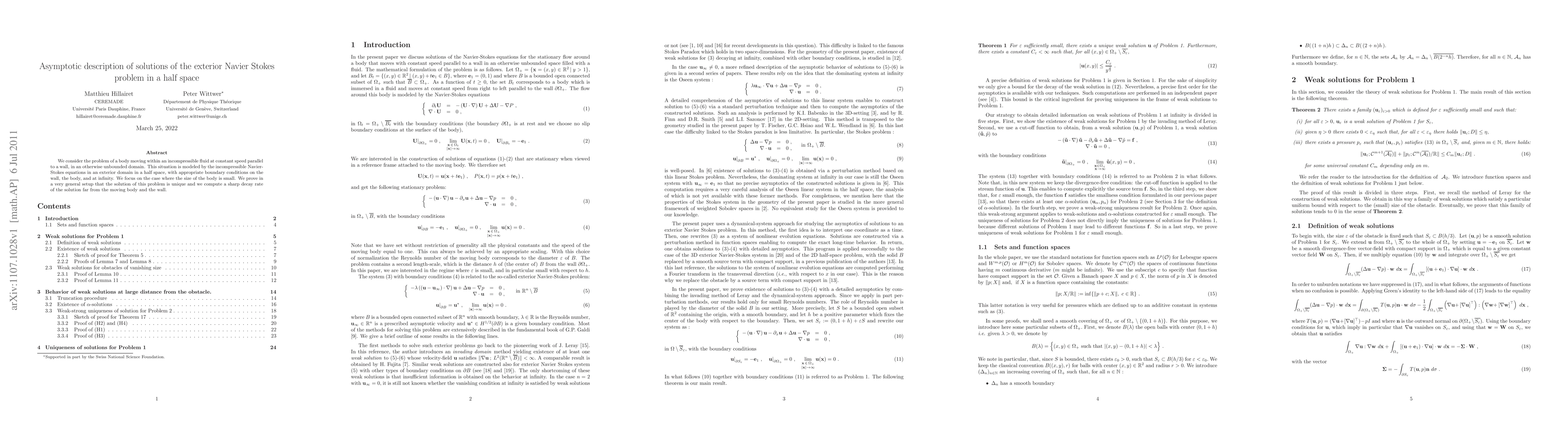 The study investigates the Navier-Stokes equations in an exterior half space with a small body moving at constant speed parallel to a wall, finding a unique solution with sharp decay rates far from the body and wall.