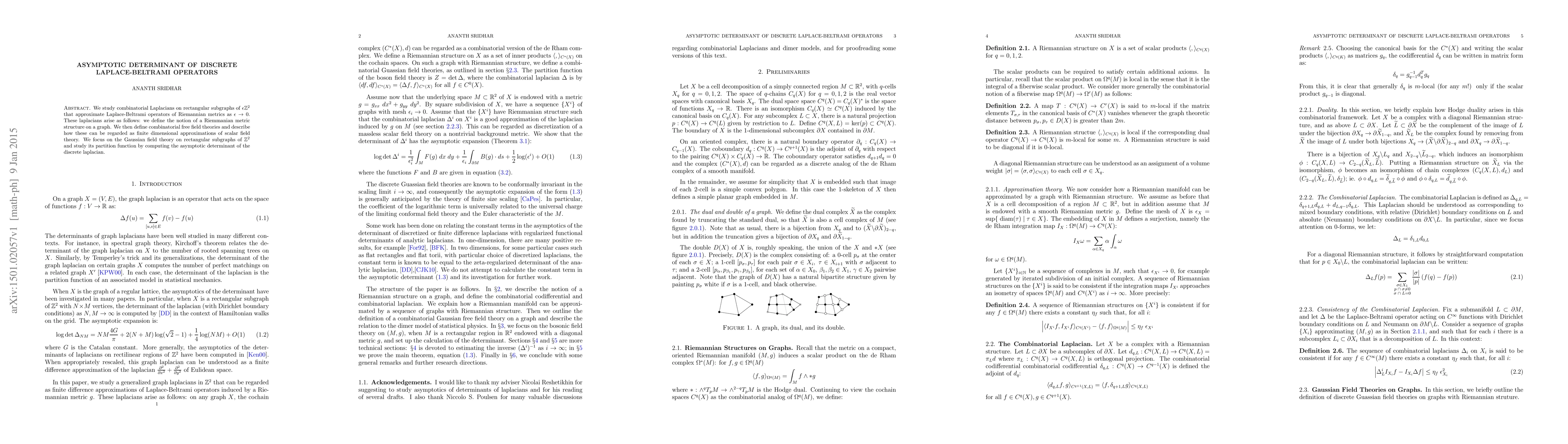 We study combinatorial Laplacians on rectangular subgraphs of $ \epsilon \mathbb{Z}^2 $ that approximate Laplace-Beltrami operators of Riemannian metrics as $ \epsilon \rightarrow 0 $. These laplacians arise as follows: we define the notion of a Riemmanian metric structure on a graph. We then define combinatorial free field theories and describe how these can be regarded as finite dimensional approximations of scalar field theory. We focus on the Gaussian field theory on rectangular subgraphs of $ \mathbb{Z}^2 $ and study its partition function by computing the asymptotic determinant of the discrete laplacian.