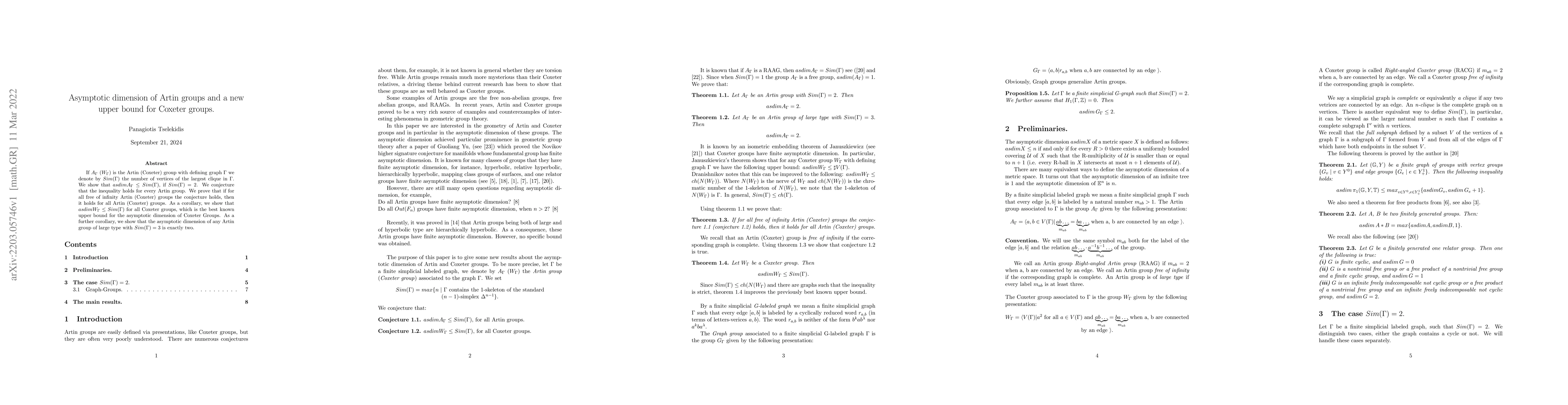 If $A_\Gamma$ ($W_\Gamma$) is the Artin (Coxeter) group with defining graph $\Gamma$ we denote by $Sim(\Gamma)$ the number of vertices of the largest clique in $\Gamma$. We show that $asdimA_\Gamma \leq Sim(\Gamma)$, if $Sim(\Gamma)=2$. We conjecture that the inequality holds for every Artin group. We prove that if for all free of infinity Artin (Coxeter) groups the conjecture holds, then it holds for all Artin (Coxeter) groups. As a corollary, we show that $asdimW_\Gamma \leq Sim(\Gamma)$ for all Coxeter groups, which is the best known upper bound for the asymptotic dimension of Coxeter Groups. As a further corollary, we show that the asymptotic dimension of any Artin group of large type with $Sim(\Gamma)=3$ is exactly two.