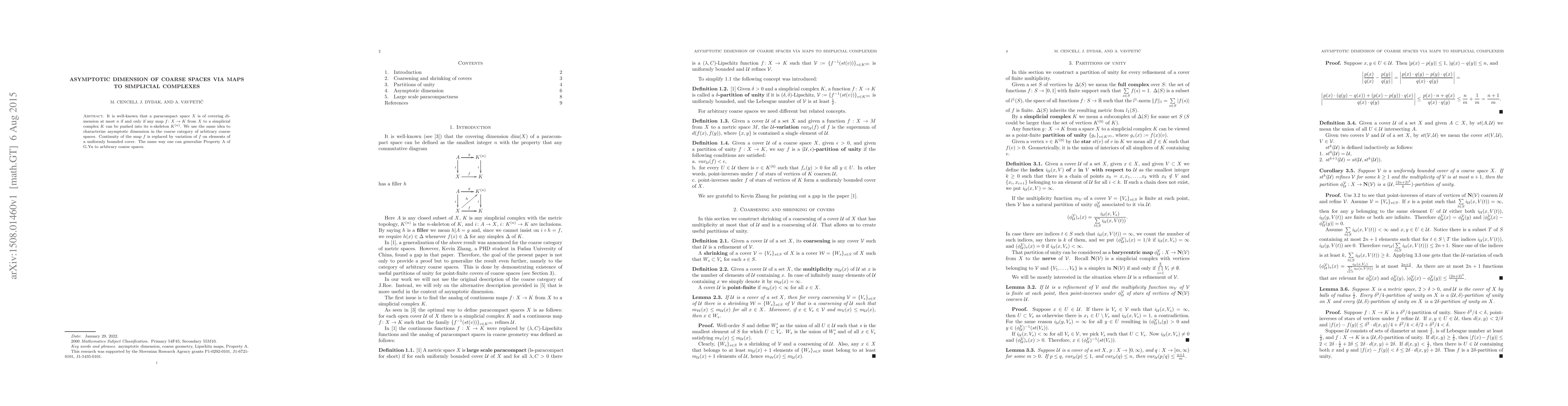 It is well-known that a paracompact space $X$ is of covering dimension at most $n$ if and only if any map $f\colon X\to K$ from $X$ to a simplicial complex $K$ can be pushed into its $n$-skeleton $K^{(n)}$. We use the same idea to characterize asymptotic dimension in the coarse category of arbitrary coarse spaces. Continuity of the map $f$ is replaced by variation of $f$ on elements of a uniformly bounded cover. The same way one can generalize Property A of G.Yu to arbitrary coarse spaces.