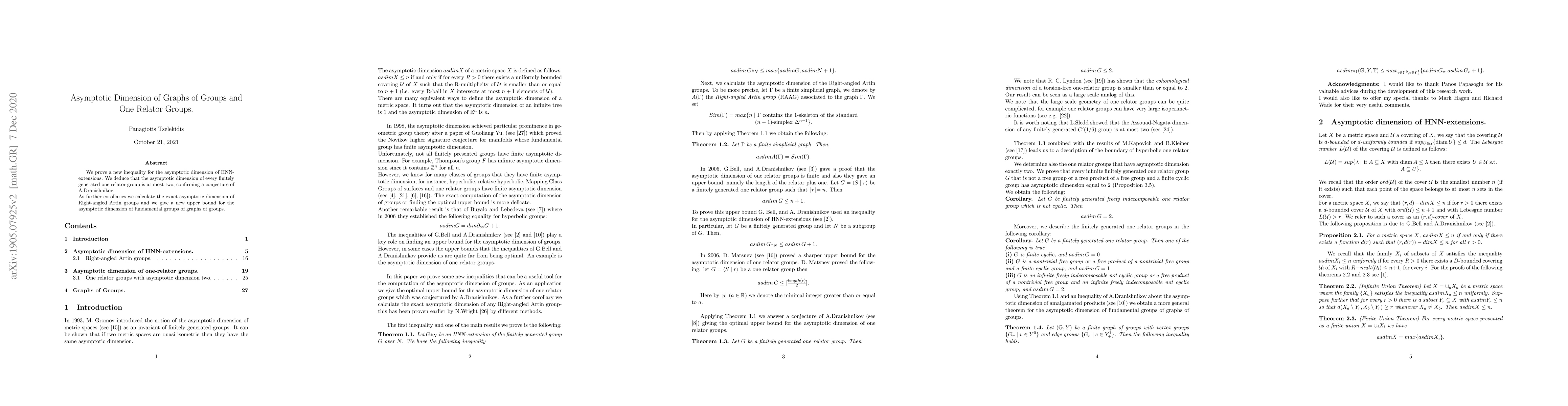 This paper establishes a new inequality for the asymptotic dimension of HNN-extensions and confirms Dranishnikov's conjecture that the asymptotic dimension of any finitely generated one relator group is at most two. It also determines the exact asymptotic dimension of Right-angled Artin groups and provides an upper bound for the asymptotic dimension of fundamental groups of graphs of groups.