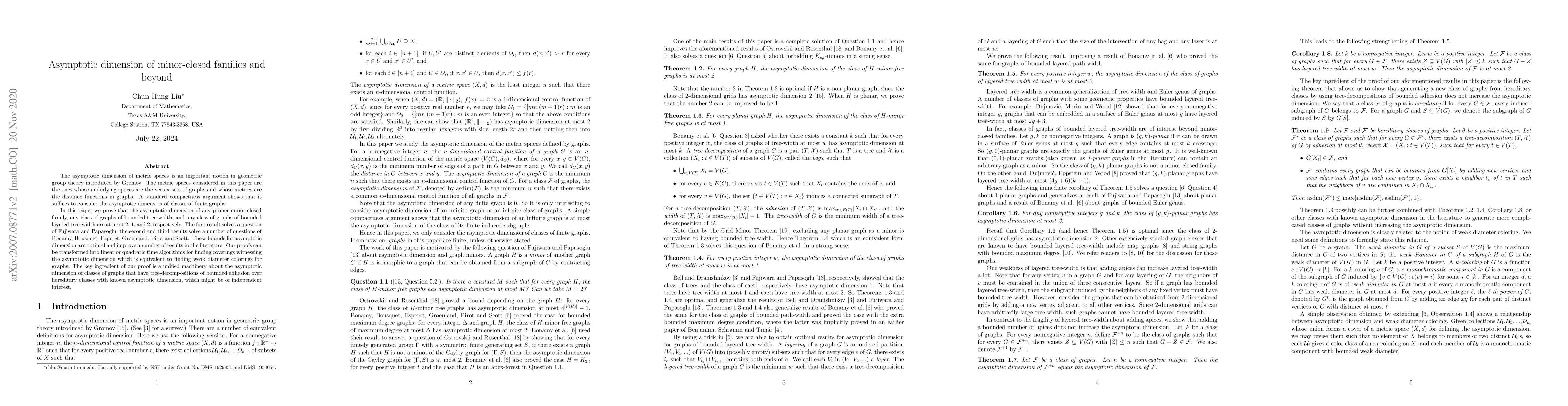 The asymptotic dimension of metric spaces is an important notion in geometric group theory introduced by Gromov. The metric spaces considered in this paper are the ones whose underlying spaces are the vertex-sets of graphs and whose metrics are the distance functions in graphs. A standard compactness argument shows that it suffices to consider the asymptotic dimension of classes of finite graphs. In this paper we prove that the asymptotic dimension of any proper minor-closed family, any class of graphs of bounded tree-width, and any class of graphs of bounded layered tree-width are at most 2, 1, and 2, respectively. The first result solves a question of Fujiwara and Papasoglu; the second and third results solve a number of questions of Bonamy, Bousquet, Esperet, Groenland, Pirot and Scott. These bounds for asymptotic dimension are optimal and improve a number of results in the literature. Our proofs can be transformed into linear or quadratic time algorithms for finding coverings witnessing the asymptotic dimension which is equivalent to finding weak diameter colorings for graphs. The key ingredient of our proof is a unified machinery about the asymptotic dimension of classes of graphs that have tree-decompositions of bounded adhesion over hereditary classes with known asymptotic dimension, which might be of independent interest.