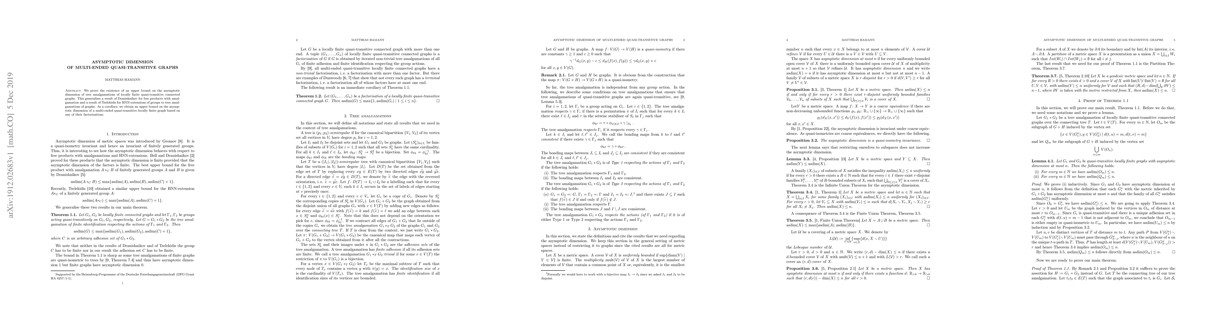 Researchers prove an upper bound on the asymptotic dimension of tree amalgamations of locally finite quasi-transitive connected graphs, generalizing previous results for free products with amalgamation and HNN-extensions.