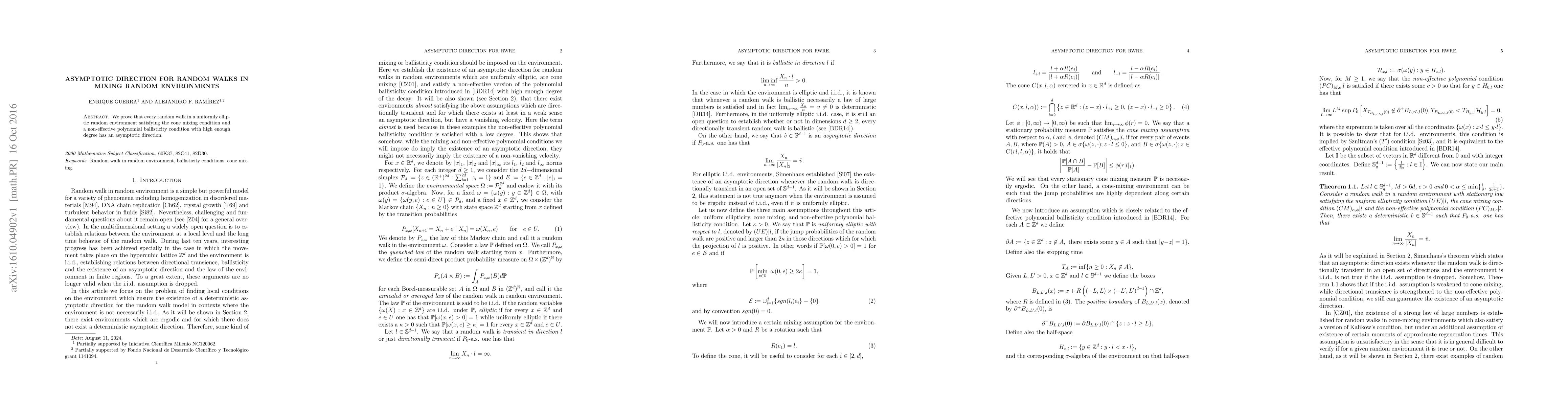 Summary: This paper demonstrates that random walks in uniformly elliptic random environments, under specific mixing and ballisticity conditions, exhibit an asymptotic direction. The findings establish the existence of a directional trend in the long-term behavior of such random walks.