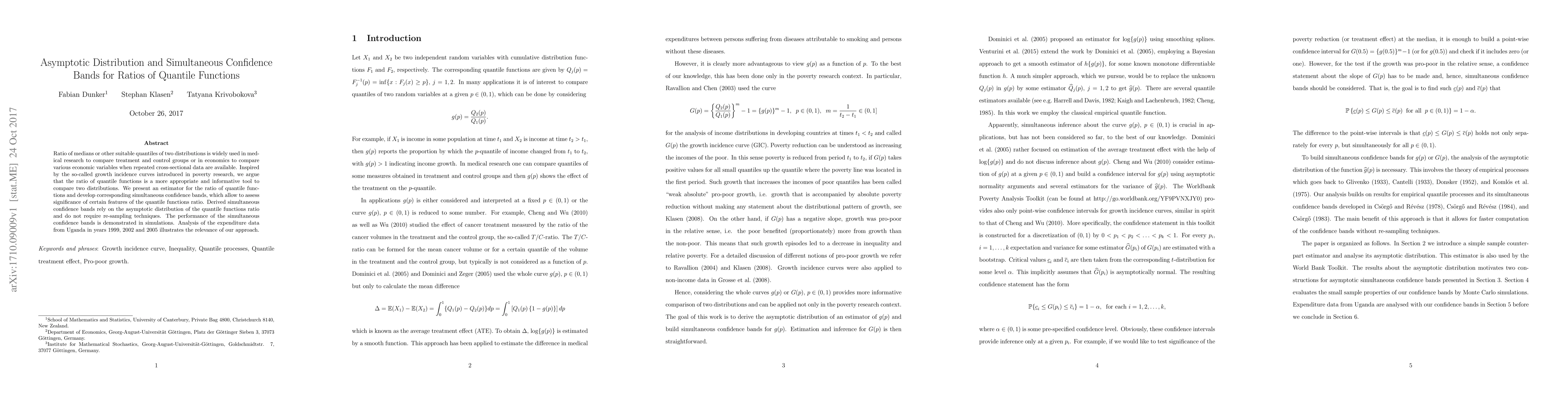 This paper proposes an estimator for the ratio of quantile functions to compare two distributions and develops simultaneous confidence bands for this ratio, relying on asymptotic distribution without re-sampling. The method is demonstrated through simulations and applied to expenditure data from Uganda.