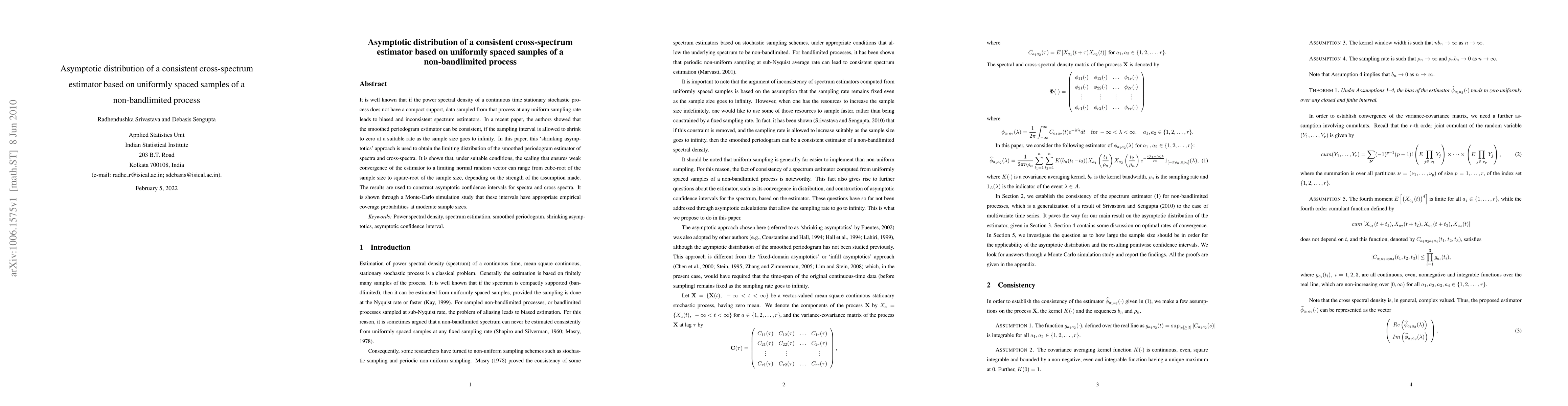 It is well known that if the power spectral density of a continuous time stationary stochastic process does not have a compact support, data sampled from that process at any uniform sampling rate leads to biased and inconsistent spectrum estimators. In a recent paper, the authors showed that the smoothed periodogram estimator can be consistent, if the sampling interval is allowed to shrink to zero at a suitable rate as the sample size goes to infinity. In this paper, this `shrinking asymptotics' approach is used to obtain the limiting distribution of the smoothed periodogram estimator of spectra and cross-spectra. It is shown that, under suitable conditions, the scaling that ensures weak convergence of the estimator to a limiting normal random vector can range from cube-root of the sample size to square-root of the sample size, depending on the strength of the assumption made. The results are used to construct asymptotic confidence intervals for spectra and cross spectra. It is shown through a Monte-Carlo simulation study that these intervals have appropriate empirical coverage probabilities at moderate sample sizes.