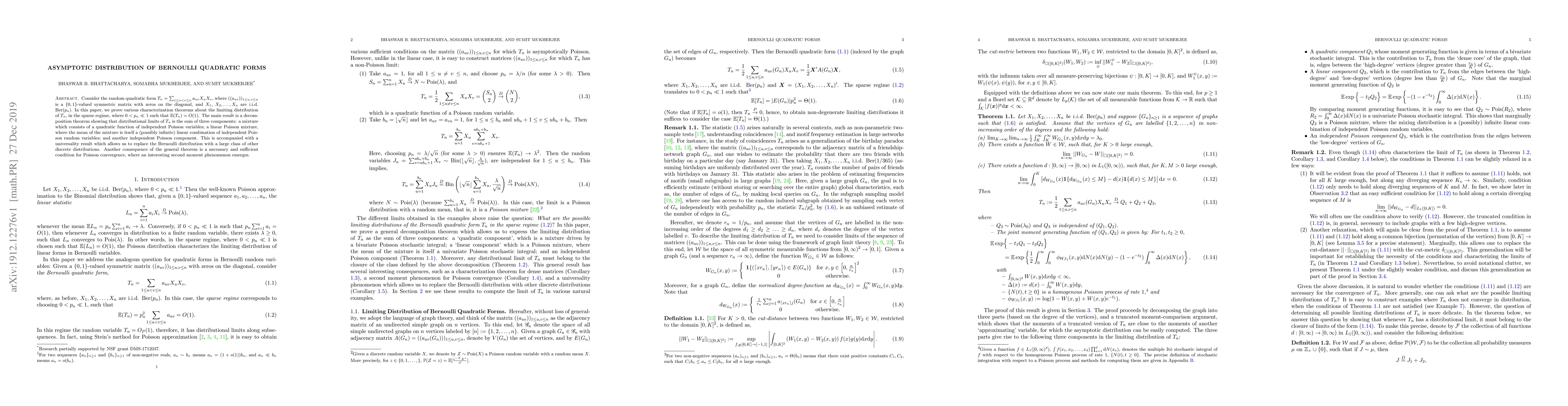 Consider the random quadratic form $T_n=\sum_{1 \leq u < v \leq n} a_{uv} X_u X_v$, where $((a_{uv}))_{1 \leq u, v \leq n}$ is a $\{0, 1\}$-valued symmetric matrix with zeros on the diagonal, and $X_1,$ $X_2, \ldots, X_n$ are i.i.d. $\mathrm{Ber}(p_n)$. In this paper, we prove various characterization theorems about the limiting distribution of $T_n$, in the sparse regime, where $0 < p_n \ll 1$ such that $\mathbb E(T_n)=O(1).$ The main result is a decomposition theorem showing that distributional limits of $T_n$ is the sum of three components: a mixture which consists of a quadratic function of independent Poisson variables; a linear Poisson mixture, where the mean of the mixture is itself a (possibly infinite) linear combination of independent Poisson random variables; and another independent Poisson component. This is accompanied with a universality result which allows us to replace the Bernoulli distribution with a large class of other discrete distributions. Another consequence of the general theorem is a necessary and sufficient condition for Poisson convergence, where an interesting second moment phenomenon emerges.