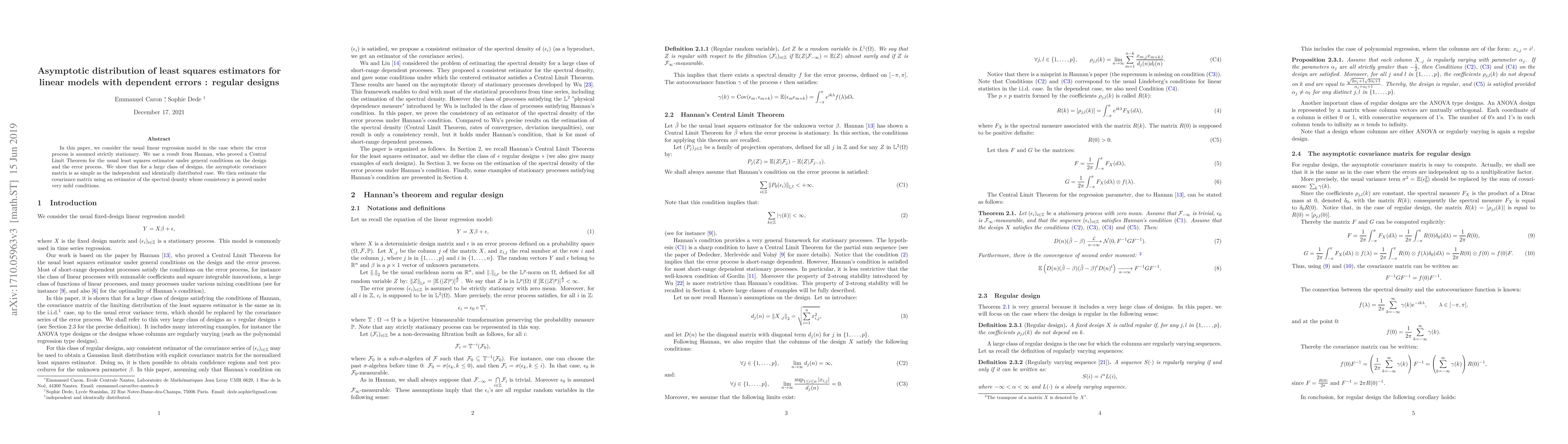 In this paper, we consider the usual linear regression model in the case where the error process is assumed strictly stationary. We use a result from Hannan, who proved a Central Limit Theorem for the usual least squares estimator under general conditions on the design and on the error process. We show that for a large class of designs, the asymptotic covariance matrix is as simple as the independent and identically distributed case. We then estimate the covariance matrix using an estimator of the spectral density whose consistency is proved under very mild conditions.