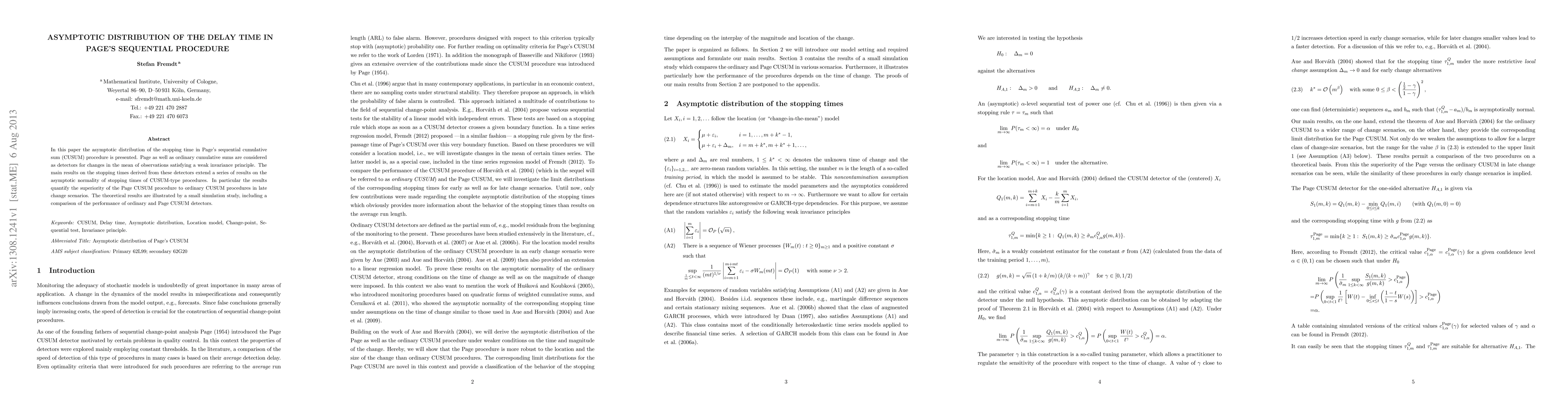 This paper investigates the asymptotic distribution of delay times in Page's sequential procedure for detecting changes in means, showing its superiority over ordinary CUSUM procedures in late change scenarios.