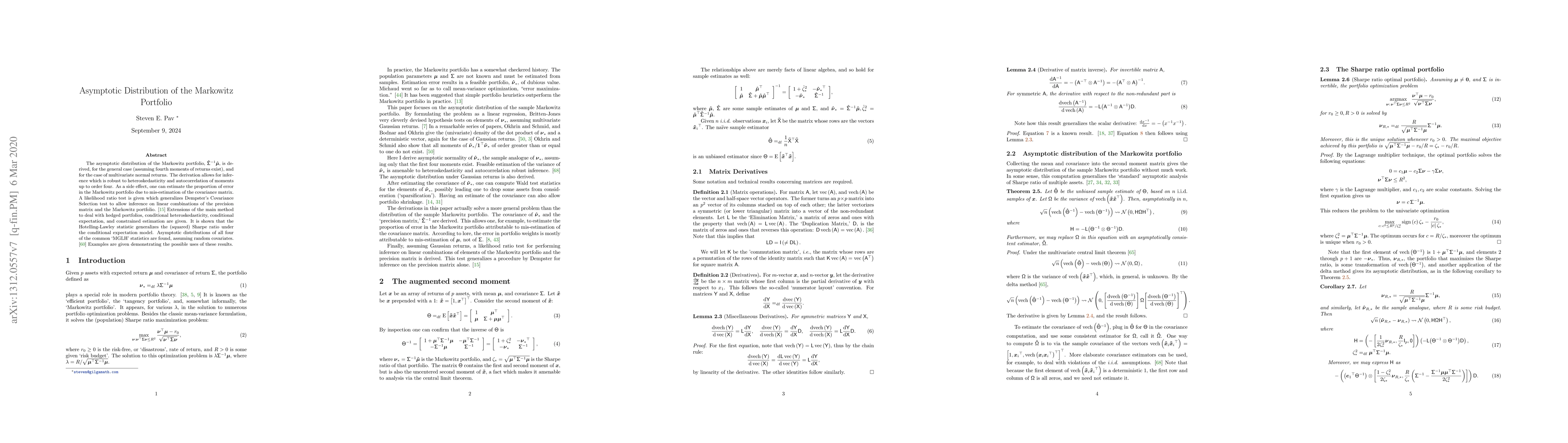 The asymptotic distribution of the Markowitz portfolio is derived, for the general case (assuming fourth moments of returns exist), and for the case of multivariate normal returns. The derivation allows for inference which is robust to heteroskedasticity and autocorrelation of moments up to order four. As a side effect, one can estimate the proportion of error in the Markowitz portfolio due to mis-estimation of the covariance matrix. A likelihood ratio test is given which generalizes Dempster's Covariance Selection test to allow inference on linear combinations of the precision matrix and the Markowitz portfolio. Extensions of the main method to deal with hedged portfolios, conditional heteroskedasticity, conditional expectation, and constrained estimation are given. It is shown that the Hotelling-Lawley statistic generalizes the (squared) Sharpe ratio under the conditional expectation model. Asymptotic distributions of all four of the common `MGLH' statistics are found, assuming random covariates. Examples are given demonstrating the possible uses of these results.