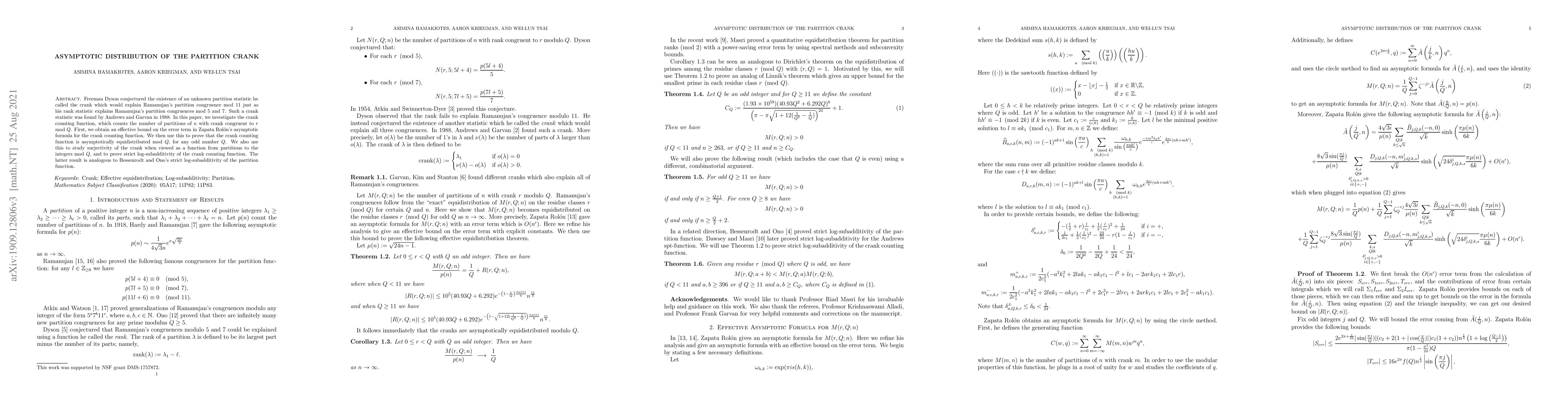 This paper proves that the partition crank is asymptotically equidistributed modulo Q for any odd number Q, using effective bounds on an error term to show its surjectivity and strict log-subadditivity.