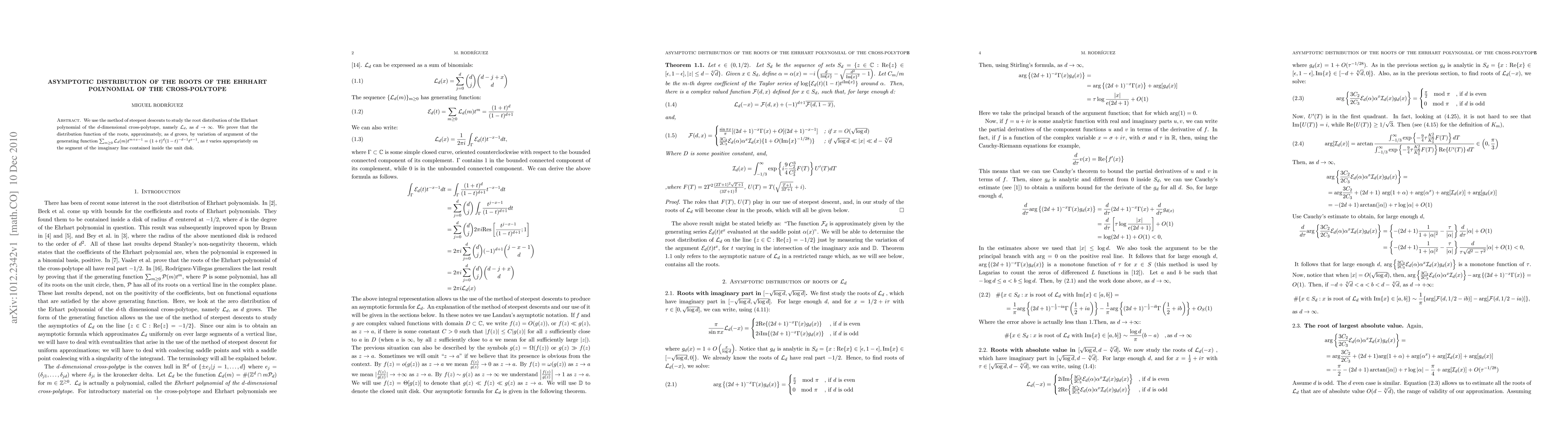 A research paper studies the distribution of roots of the Ehrhart polynomial of the d-dimensional cross-polytope as d approaches infinity, using a method called steepest descents to approximate the root distribution function.
