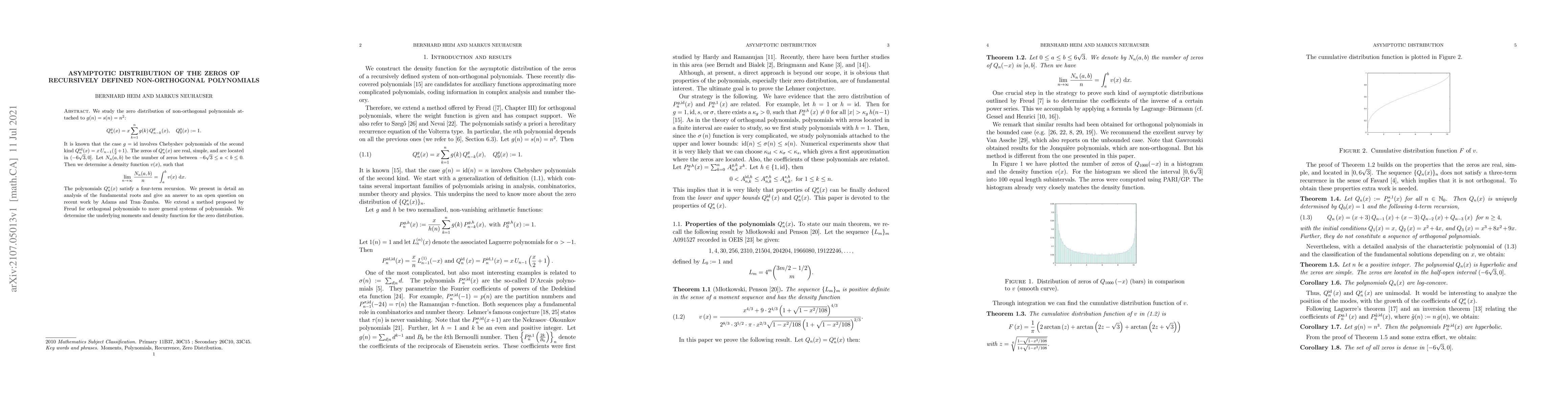 This paper investigates the asymptotic distribution of zeros for recursively defined non-orthogonal polynomials with a specific four-term recursion. It determines a density function for the zeros, which converges to a limit as the polynomial degree increases, extending Freud's method for orthogonal polynomials to this broader context.
