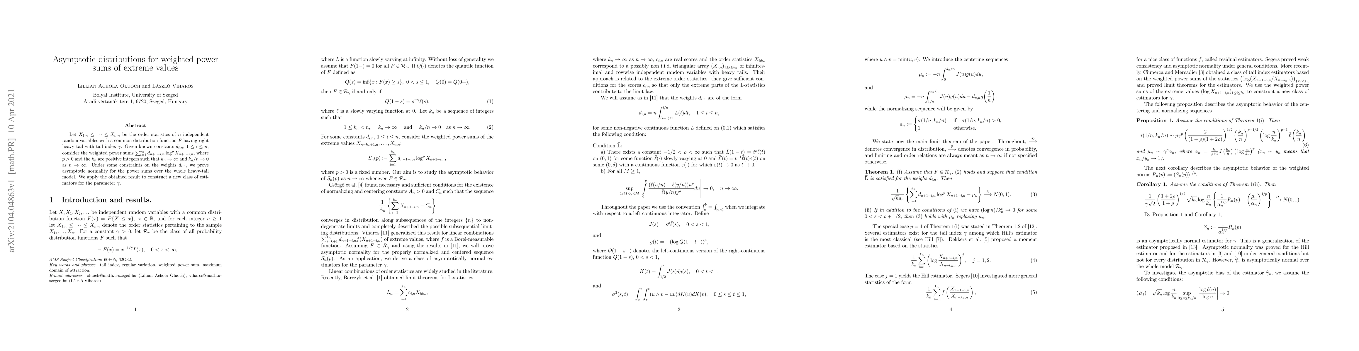 This paper investigates the asymptotic distributions of weighted power sums of extreme values from heavy-tailed distributions, proving asymptotic normality under certain constraints on the weights. It also introduces a new class of estimators for the tail index parameter $\gamma$ based on these results.
