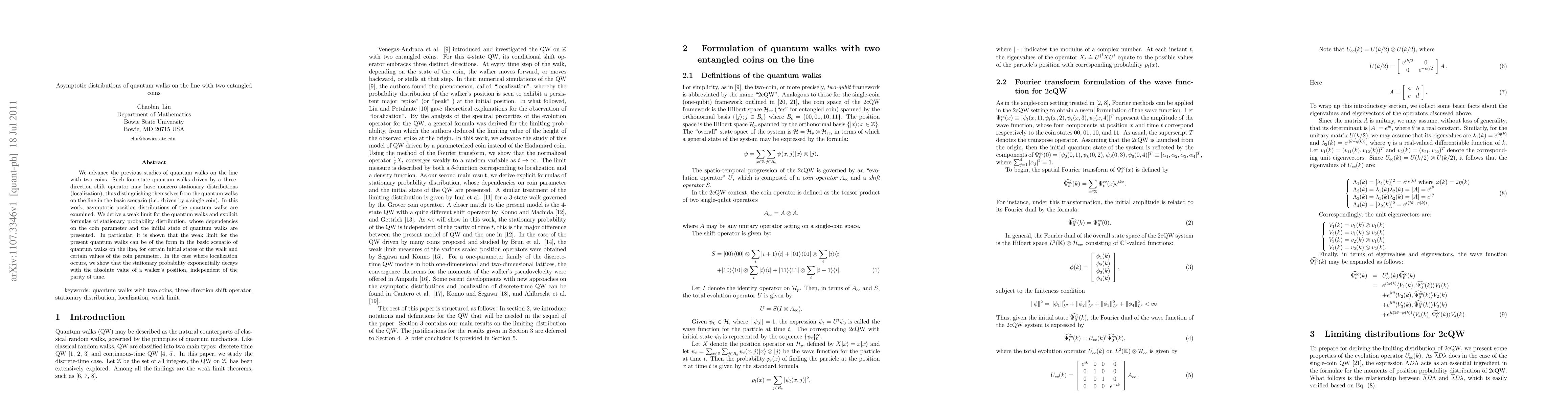 This paper investigates quantum walks on a line using two entangled coins, deriving asymptotic position distributions and explicit formulas for the stationary probability distribution. It reveals that these four-state quantum walks can localize and that their weak limit can resemble the basic scenario of quantum walks, with stationary probability decaying exponentially with position.
