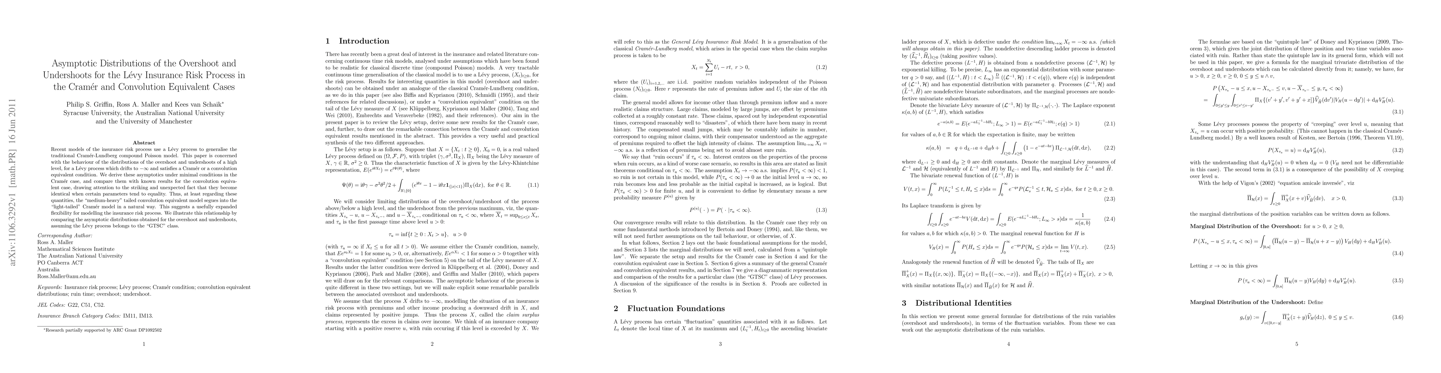 Recent models of the insurance risk process use a L\'evy process to generalise the traditional Cram\'er-Lundberg compound Poisson model. This paper is concerned with the behaviour of the distributions of the overshoot and undershoots of a high level, for a L\'{e}vy process which drifts to $-\infty$ and satisfies a Cram\'er or a convolution equivalent condition. We derive these asymptotics under minimal conditions in the Cram\'er case, and compare them with known results for the convolution equivalent case, drawing attention to the striking and unexpected fact that they become identical when certain parameters tend to equality. Thus, at least regarding these quantities, the "medium-heavy" tailed convolution equivalent model segues into the "light-tailed" Cram\'er model in a natural way. This suggests a usefully expanded flexibility for modelling the insurance risk process. We illustrate this relationship by comparing the asymptotic distributions obtained for the overshoot and undershoots, assuming the L\'evy process belongs to the "GTSC" class.