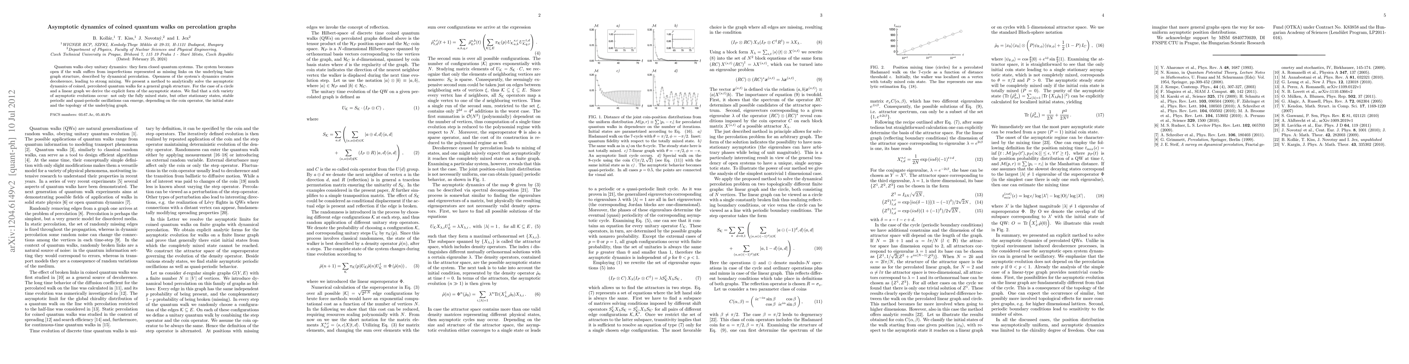 Quantum walks obey unitary dynamics: they form closed quantum systems. The system becomes open if the walk suffers from imperfections represented as missing links on the underlying basic graph structure, described by dynamical percolation. Openness of the system's dynamics creates decoherence, leading to strong mixing. We present a method to analytically solve the asymptotic dynamics of coined, percolated quantum walks for a general graph structure. For the case of a circle and a linear graph we derive the explicit form of the asymptotic states. We find that a rich variety of asymptotic evolutions occur: not only the fully mixed state, but other stationary states; stable periodic and quasiperiodic oscillations can emerge, depending on the coin operator, the initial state, and the topology of the underlying graph.