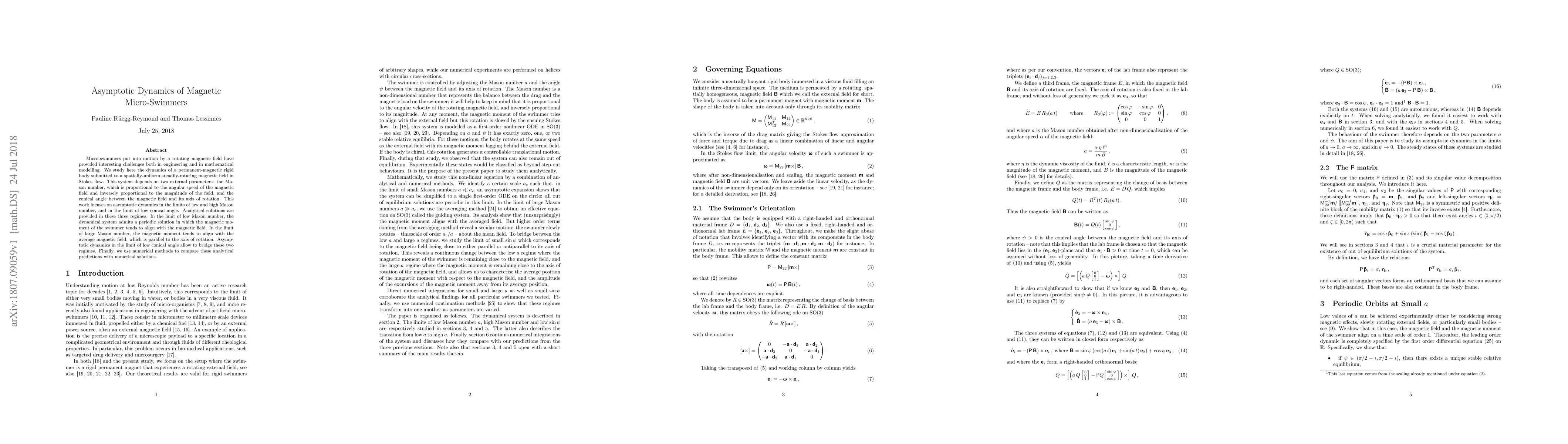 Micro-swimmers put into motion by a rotating magnetic field have provided interesting challenges both in engineering and in mathematical modelling. We study here the dynamics of a permanent-magnetic rigid body submitted to a spatially-uniform steadily-rotating magnetic field in Stokes flow. This system depends on two external parameters: the Ma- son number, which is proportional to the angular speed of the magnetic field and inversely proportional to the magnitude of the field, and the conical angle between the magnetic field and its axis of rotation. This work focuses on asymptotic dynamics in the limits of low and high Mason number, and in the limit of low conical angle. Analytical solutions are provided in these three regimes. In the limit of low Mason number, the dynamical system admits a periodic solution in which the magnetic moment of the swimmer tends to align with the magnetic field. In the limit of large Mason number, the magnetic moment tends to align with the average magnetic field, which is parallel to the axis of rotation. Asymptotic dynamics in the limit of low conical angle allow to bridge these two regimes. Finally, we use numerical methods to compare these analytical predictions with numerical solutions.