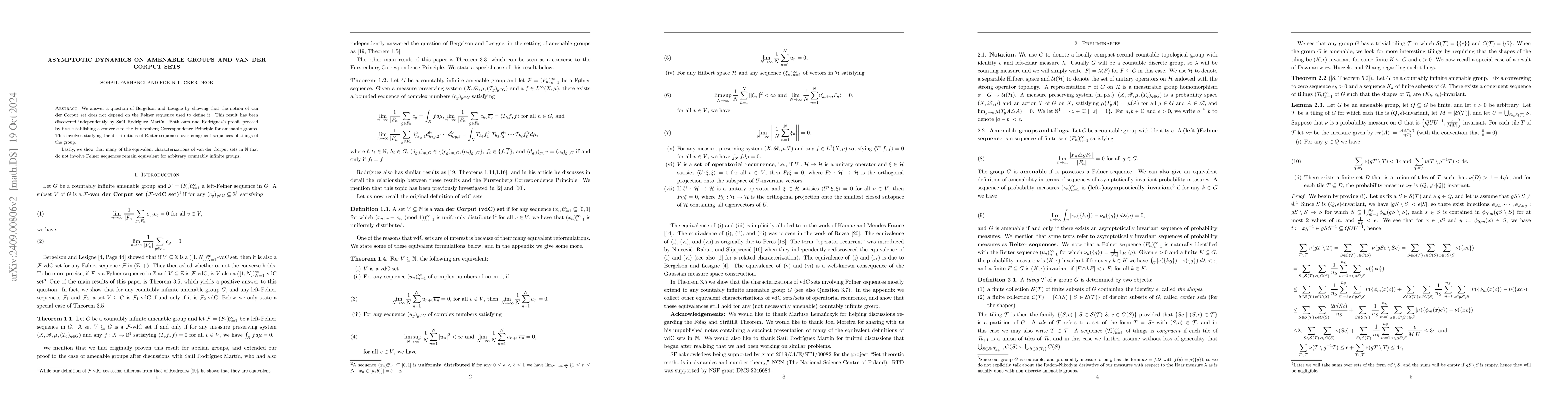 We answer a question of Bergelson and Lesigne by showing that the notion of van der Corput set does not depend on the F\o lner sequence used to define it. This result has been discovered independently by Sa\'ul Rodr\'iguez Mart\'in. Both ours and Rodr\'iguez's proofs proceed by first establishing a converse to the Furstenberg Correspondence Principle for amenable groups. This involves studying the distributions of Reiter sequences over congruent sequences of tilings of the group. Lastly, we show that many of the equivalent characterizations of van der Corput sets in $\mathbb{N}$ that do not involve F\o lner sequences remain equivalent for arbitrary countably infinite groups.