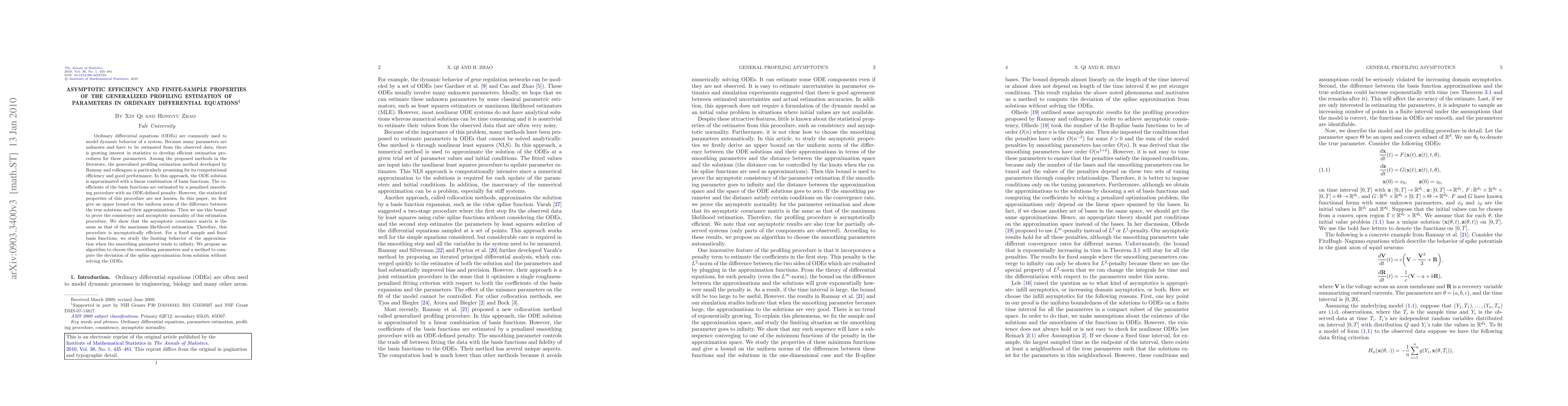 This paper investigates the generalized profiling estimation method for parameters in ordinary differential equations (ODEs), proving its consistency and asymptotic normality. It demonstrates that the method is asymptotically efficient, with an asymptotic covariance matrix equivalent to that of maximum likelihood estimation.