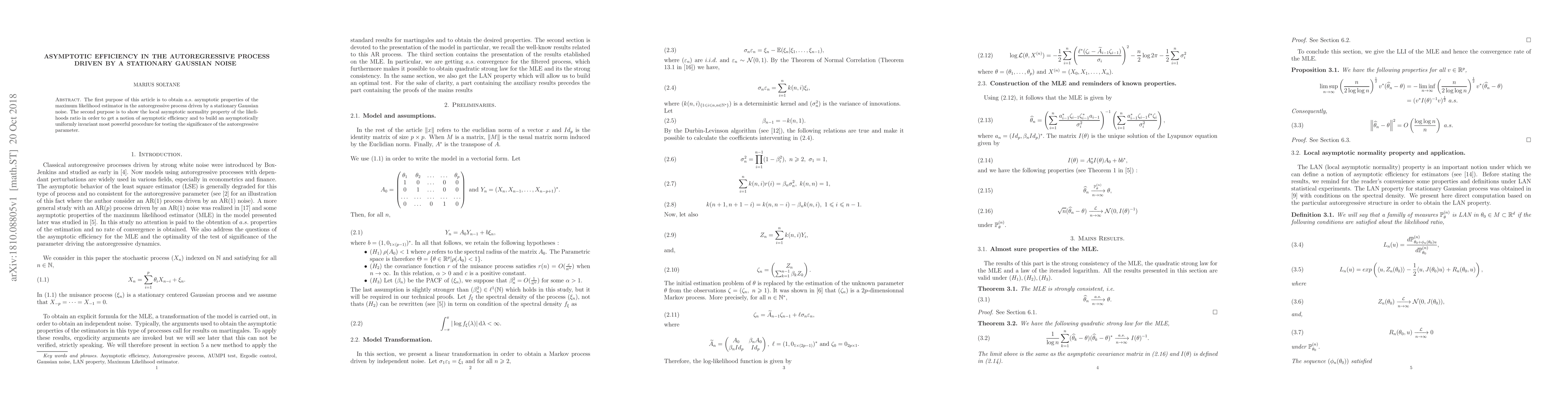 This paper explores the asymptotic properties of the maximum likelihood estimator in autoregressive processes influenced by stationary Gaussian noise, and demonstrates local asymptotic normality to establish asymptotic efficiency and develop a powerful test for the significance of the autoregressive parameter.