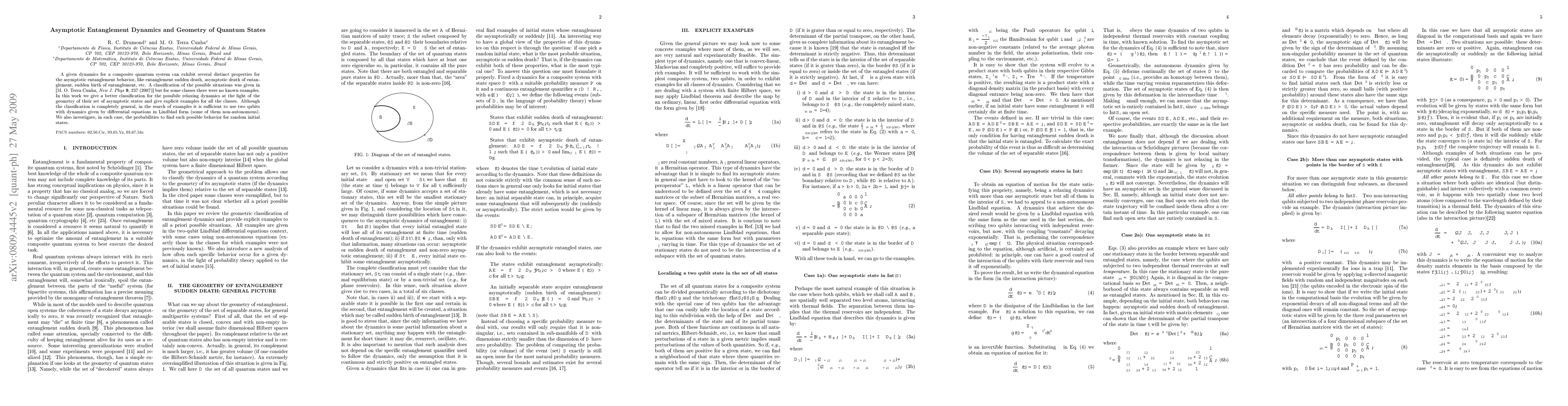 A given dynamics for a composite quantum system can exhibit several distinct properties for the asymptotic entanglement behavior, like entanglement sudden death, asymptotic death of entanglement, sudden birth of entanglement, etc. A classification of the possible situations was given in [M. O. Terra Cunha, {\emph{New J. Phys}} {\bf{9}}, 237 (2007)] but for some classes there were no known examples. In this work we give a better classification for the possibile relaxing dynamics at the light of the geometry of their set of asymptotic states and give explicit examples for all the classes. Although the classification is completely general, in the search of examples it is sufficient to use two qubits with dynamics given by differential equations in Lindblad form (some of them non-autonomous). We also investigate, in each case, the probabilities to find each possible behavior for random initial states.
