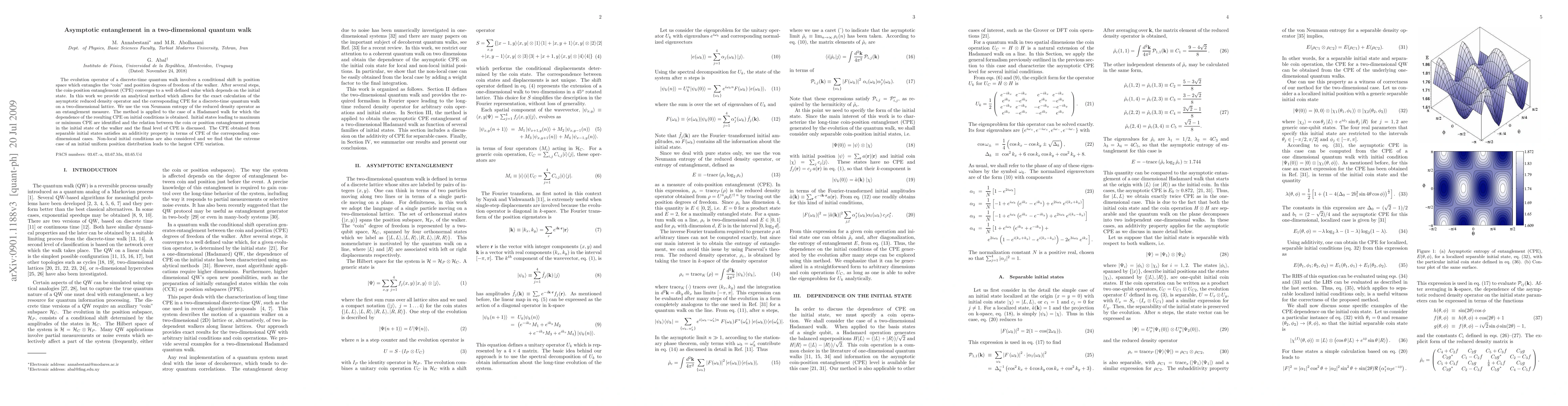 This paper develops an analytical method for calculating the asymptotic entanglement in a two-dimensional quantum walk, focusing on the convergence of coin-position entanglement (CPE) to a defined value. The study applies this method to the Hadamard walk, identifying states leading to maximum or minimum CPE and discussing the relationship between initial entanglement and final CPE.