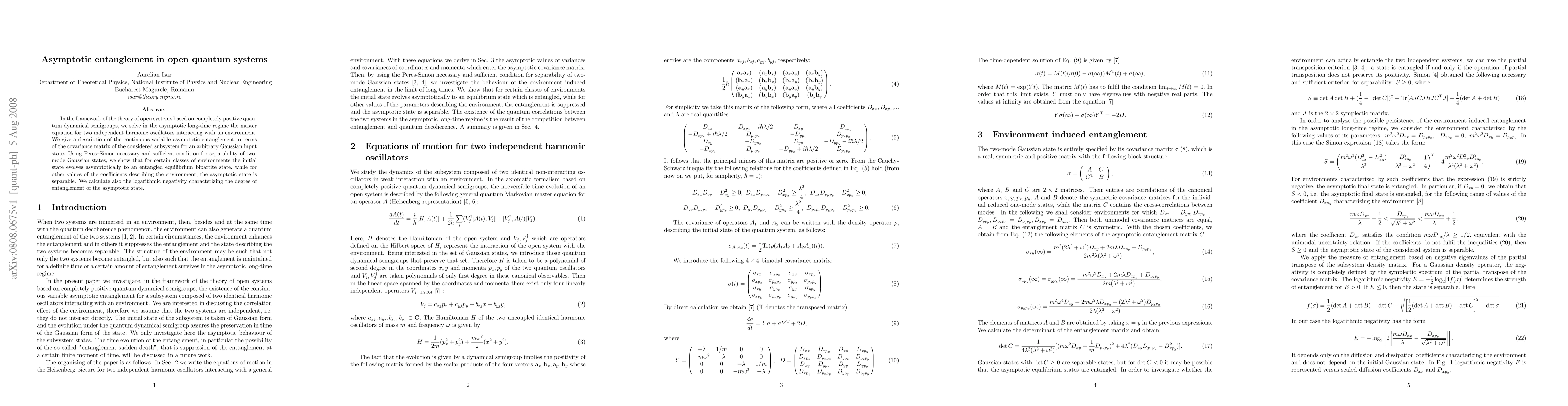 This paper investigates asymptotic entanglement in open quantum systems using completely positive quantum dynamical semigroups. It demonstrates that for certain environments, two independent harmonic oscillators evolve to an entangled state, while others lead to a separable state, quantified by the logarithmic negativity.