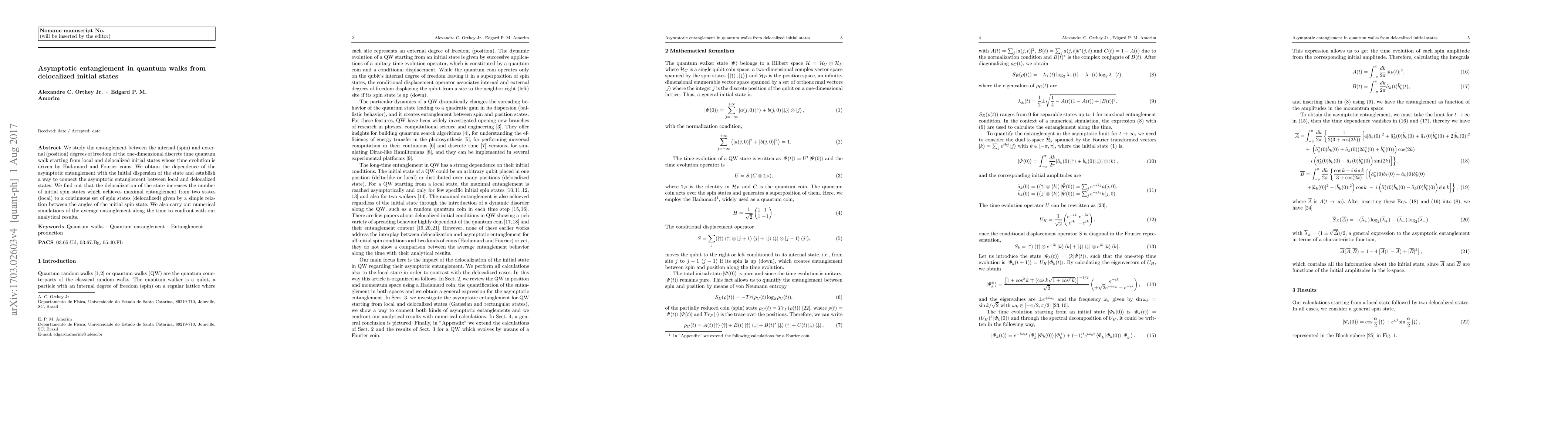 We study the entanglement between the internal (spin) and external (position) degrees of freedom of the one-dimensional discrete time quantum walk starting from local and delocalized initial states whose time evolution is driven by Hadamard and Fourier coins. We obtain the dependence of the asymptotic entanglement with the initial dispersion of the state and establish a way to connect the asymptotic entanglement between local and delocalized states. We find out that the delocalization of the state increases the number of initial spin states which achieves maximal entanglement from two states (local) to a continuous set of spin states (delocalized) given by a simple relation between the angles of the initial spin state. We also carry out numerical simulations of the average entanglement along the time to confront with our analytical results.