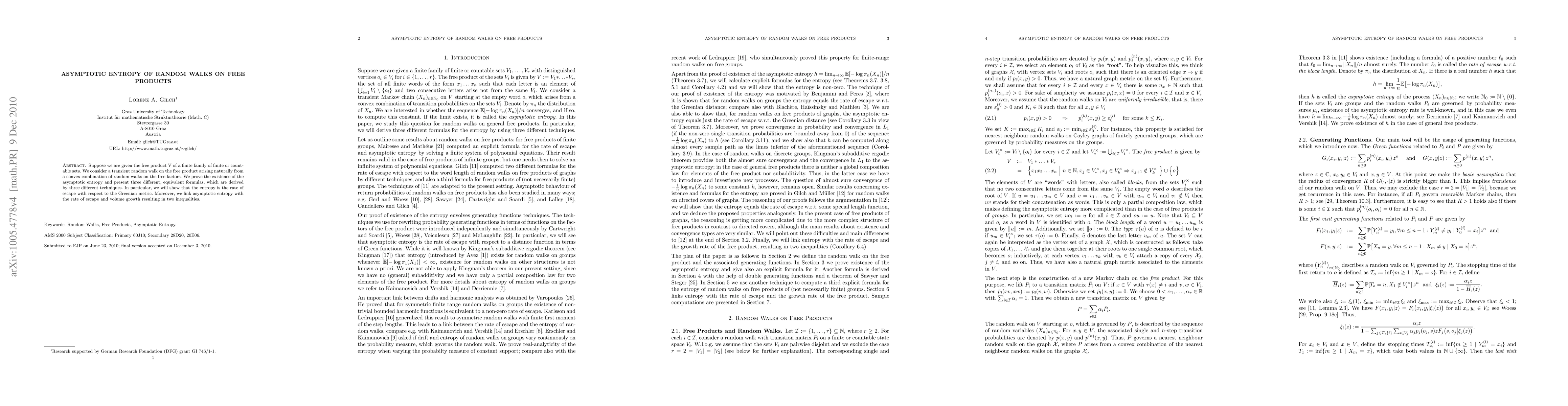 Suppose we are given the free product V of a finite family of finite or countable sets. We consider a transient random walk on the free product arising naturally from a convex combination of random walks on the free factors. We prove the existence of the asymptotic entropy and present three different, equivalent formulas, which are derived by three different techniques. In particular, we will show that the entropy is the rate of escape with respect to the Greenian metric. Moreover, we link asymptotic entropy with the rate of escape and volume growth resulting in two inequalities.