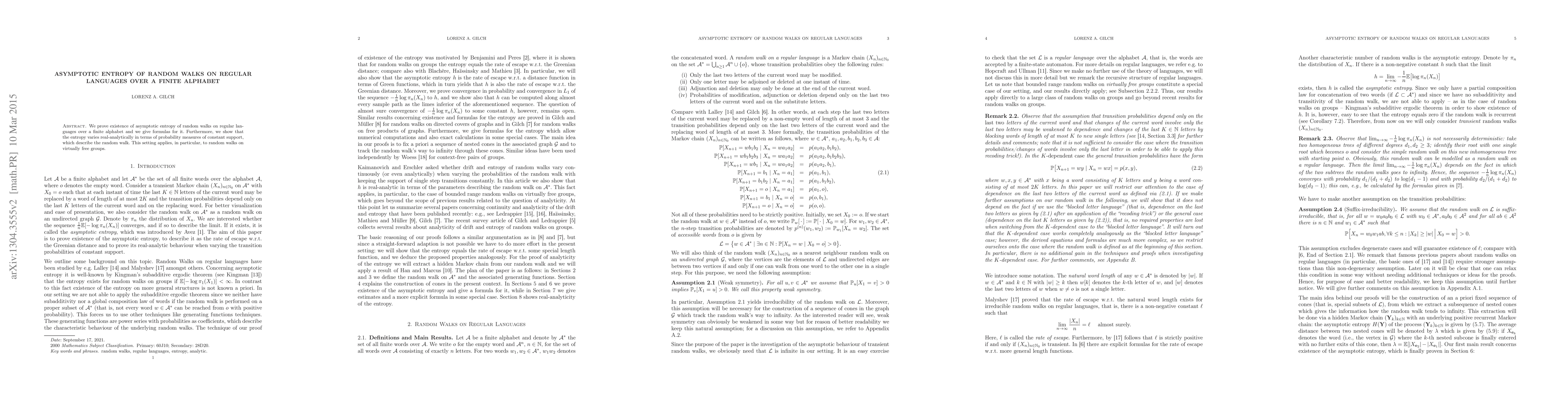 The paper establishes the existence of asymptotic entropy for random walks on regular languages over finite alphabets and provides formulas for it. It also demonstrates that this entropy varies real-analytically concerning probability measures of constant support, with applications to random walks on virtually free groups.