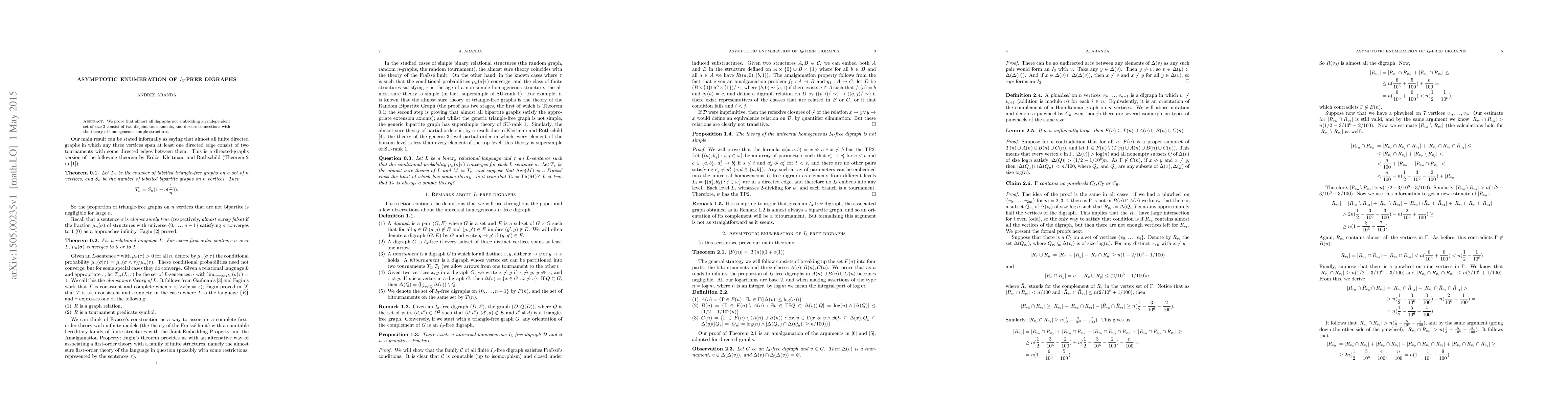 We prove that almost all digraphs not embedding an independent set of size 3 consist of two disjoint tournaments, and discuss connections with the theory of homogeneous simple structures.