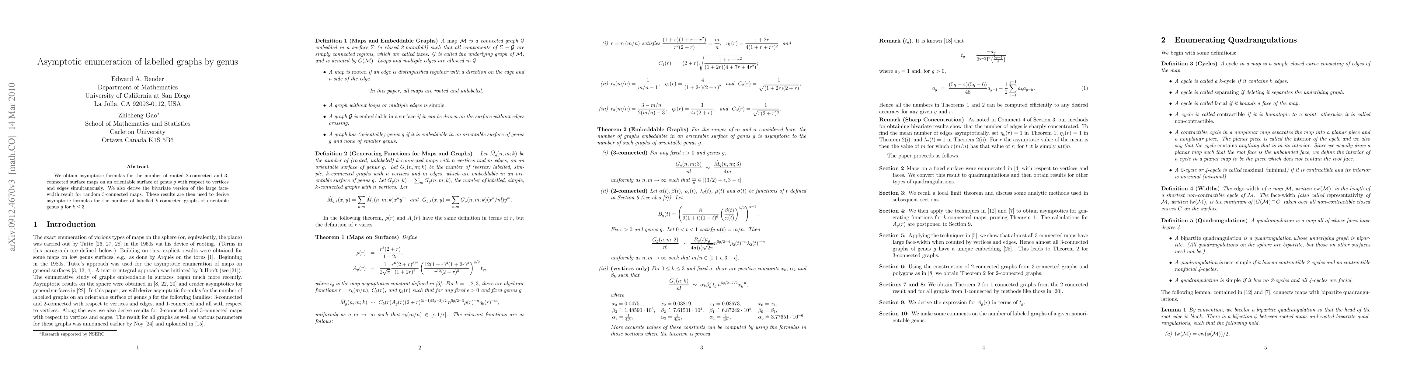 This paper provides asymptotic formulas for the enumeration of labelled graphs of a given genus, deriving results for rooted 2-connected and 3-connected surface maps in terms of vertices and edges, and establishing a bivariate large face-width result for random 3-connected maps. The findings are applied to count 1-connected, 2-connected, and 3-connected graphs by genus.