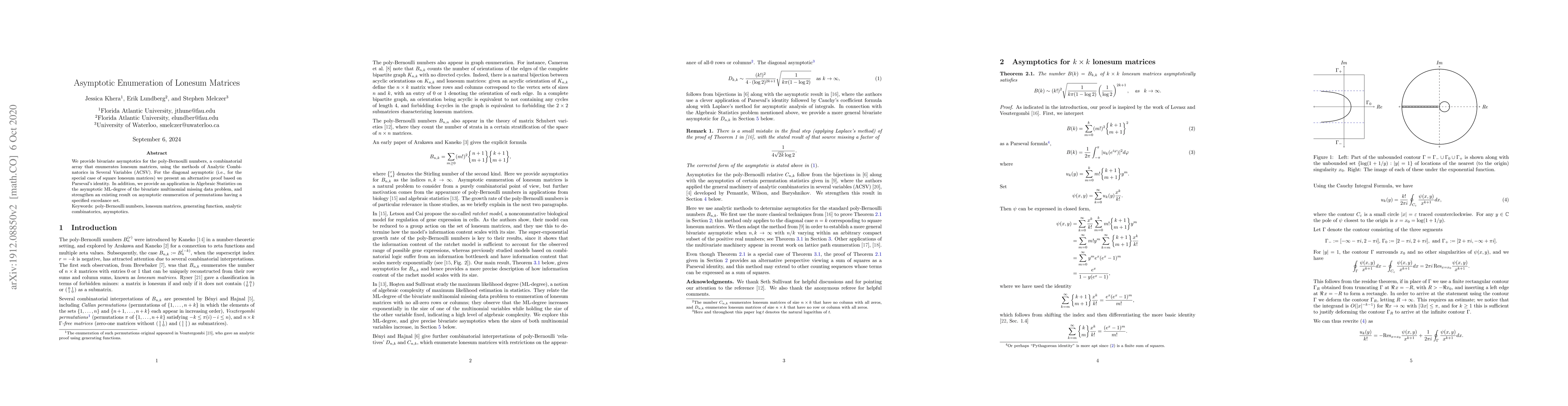 This paper uses Analytic Combinatorics in Several Variables to derive bivariate asymptotics for poly-Bernoulli numbers, which enumerate lonesum matrices, and provides an alternative proof using Parseval's identity for square lonesum matrices. It also applies these findings to Algebraic Statistics, enhancing the understanding of the asymptotic ML-degree in the bivariate multinomial missing data problem and strengthening results on permutations with specified excedance sets.