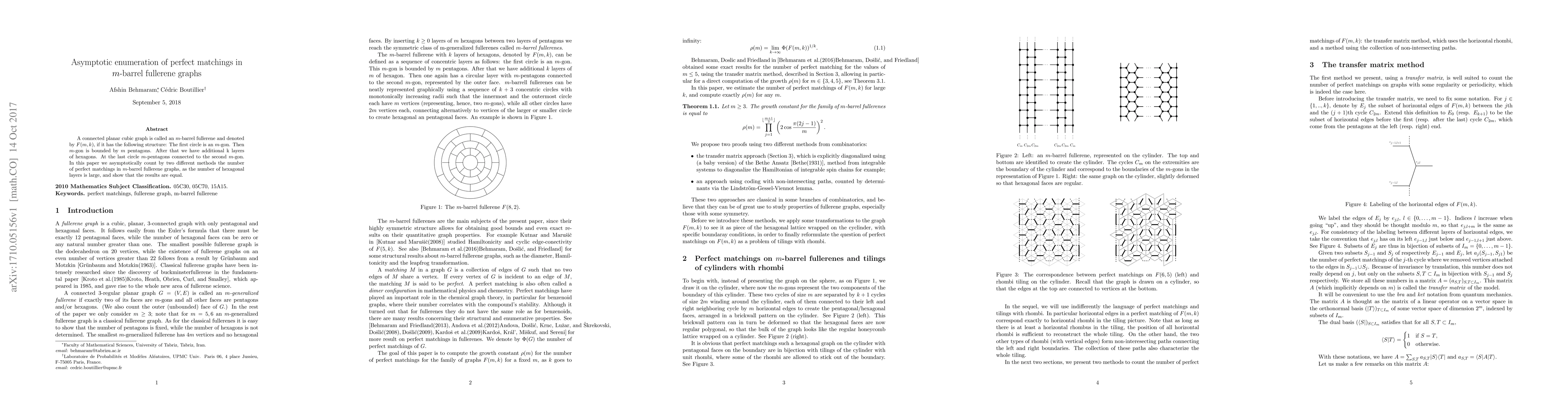 This paper presents two methods for asymptotically counting the number of perfect matchings in $m$-barrel fullerene graphs as the number of hexagonal layers increases, demonstrating that both methods yield the same result.