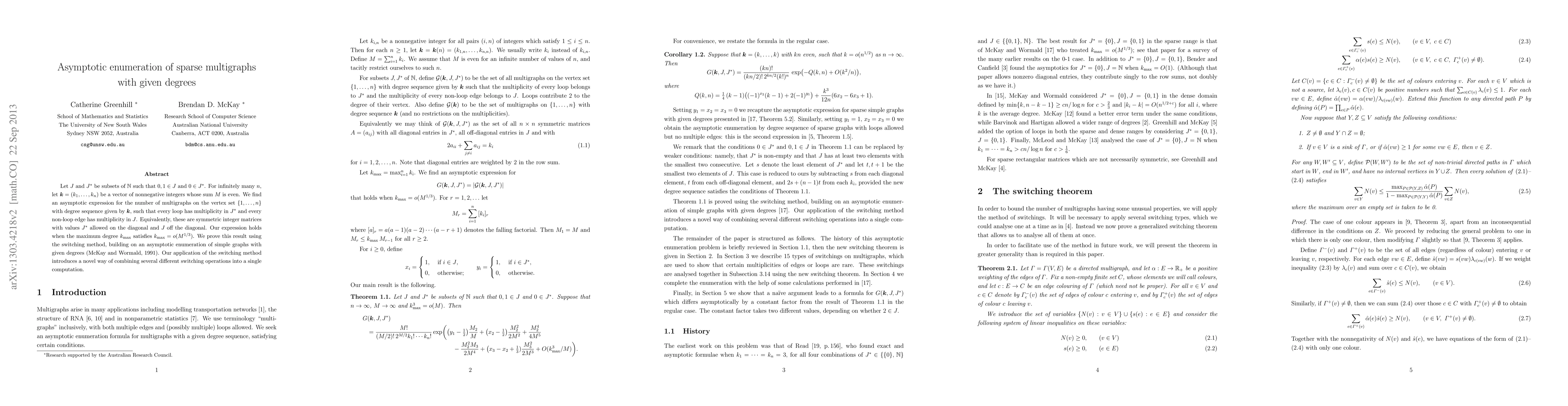 Let J and J* be subsets of Z+ such that 0,1\in J and 0\in J*. For infinitely many n, let k=(k_1,..., k_n) be a vector of nonnegative integers whose sum M is even. We find an asymptotic expression for the number of multigraphs on the vertex set {1,..., n} with degree sequence given by k, such that every loop has multiplicity in J* and every non-loop edge has multiplicity in J. Equivalently, these are symmetric integer matrices with values J* allowed on the diagonal and J off the diagonal. Our expression holds when the maximum degree K satisfies K = o(M^(1/3)). We prove this result using the switching method, building on an asymptotic enumeration of simple graphs with given degrees (McKay and Wormald, 1991). Our application of the switching method introduces a novel way of combining several different switching operations into a single computation.