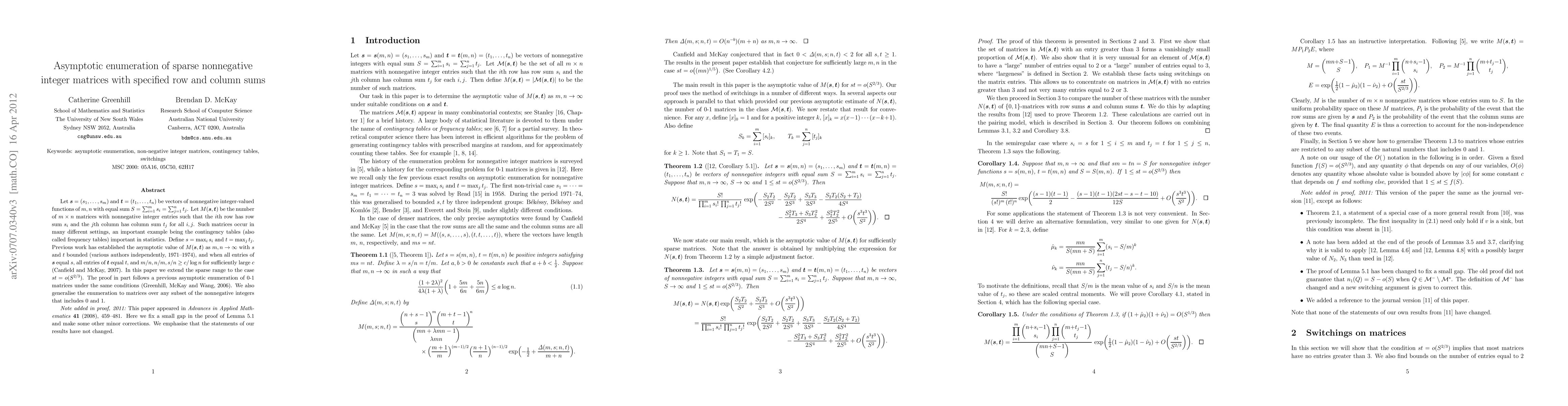 This paper extends the asymptotic enumeration of sparse nonnegative integer matrices with specified row and column sums to the case where the product of the maximum row and column sums is bounded by a lower power of the total sum. The results generalize previous findings to a broader range of sparse matrices and include enumeration over subsets of nonnegative integers.