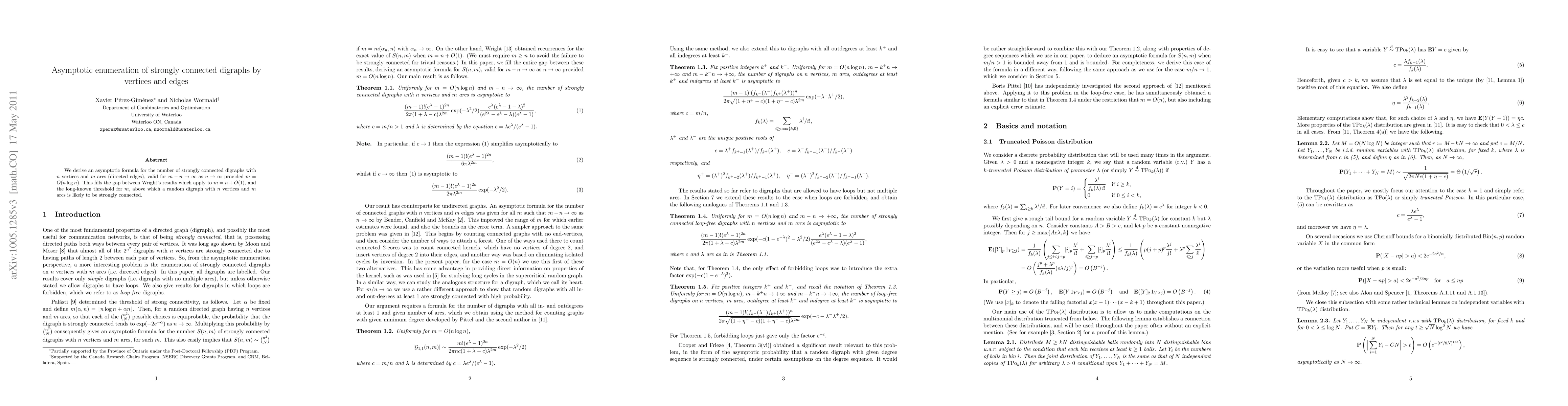 The paper derives an asymptotic formula for the number of strongly connected digraphs with n vertices and m arcs, focusing on the regime where m - n → ∞ as n → ∞, given m = O(n log n).