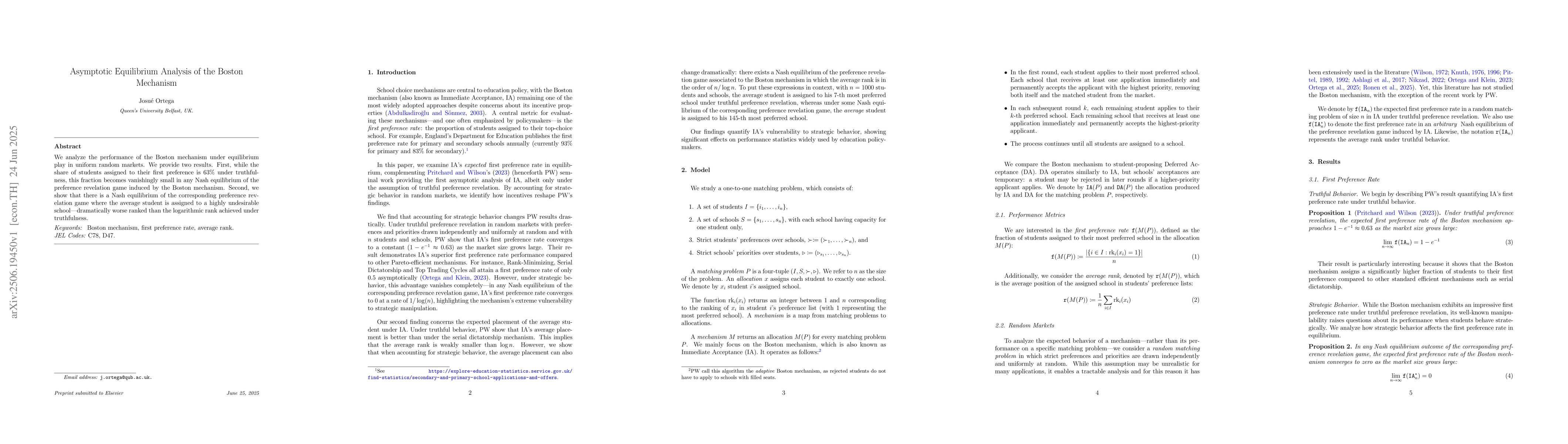 We analyze the performance of the Boston mechanism under equilibrium play in uniform random markets. We provide two results. First, while the share of students assigned to their first preference is 63% under truthfulness, this fraction becomes vanishingly small in any Nash equilibrium of the preference revelation game induced by the Boston mechanism. Second, we show that there is a Nash equilibrium of the corresponding preference revelation game where the average student is assigned to a highly undesirable school-dramatically worse ranked than the logarithmic rank achieved under truthfulness.
