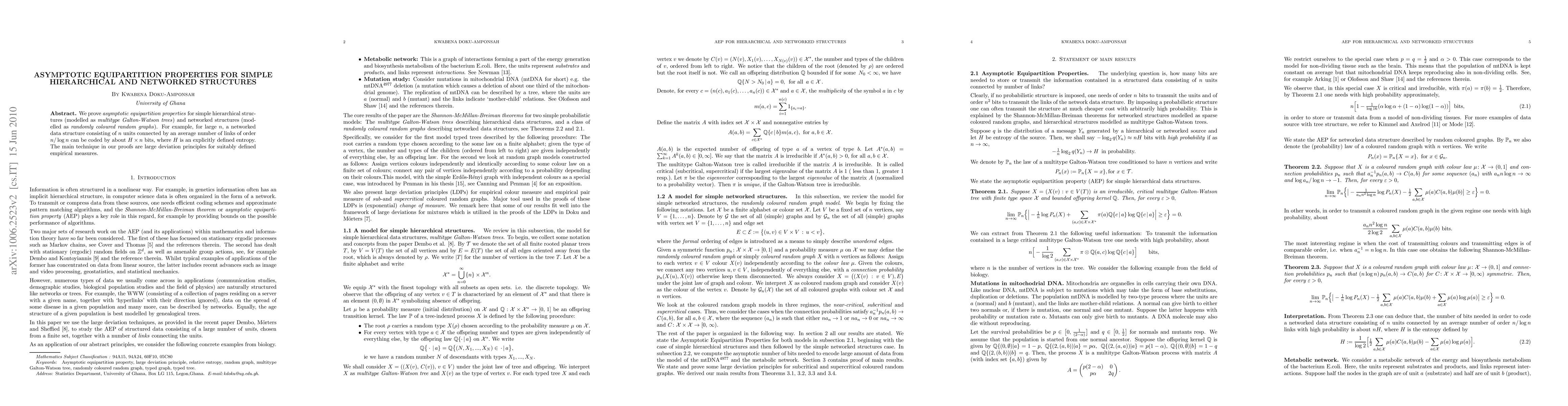 This paper proves asymptotic equipartition properties for hierarchical structures modeled as multitype Galton-Watson trees and networked structures modeled as randomly colored random graphs. The main technique involves large deviation principles for empirical measures, demonstrating that large networks can be coded efficiently using entropy-based bits.
