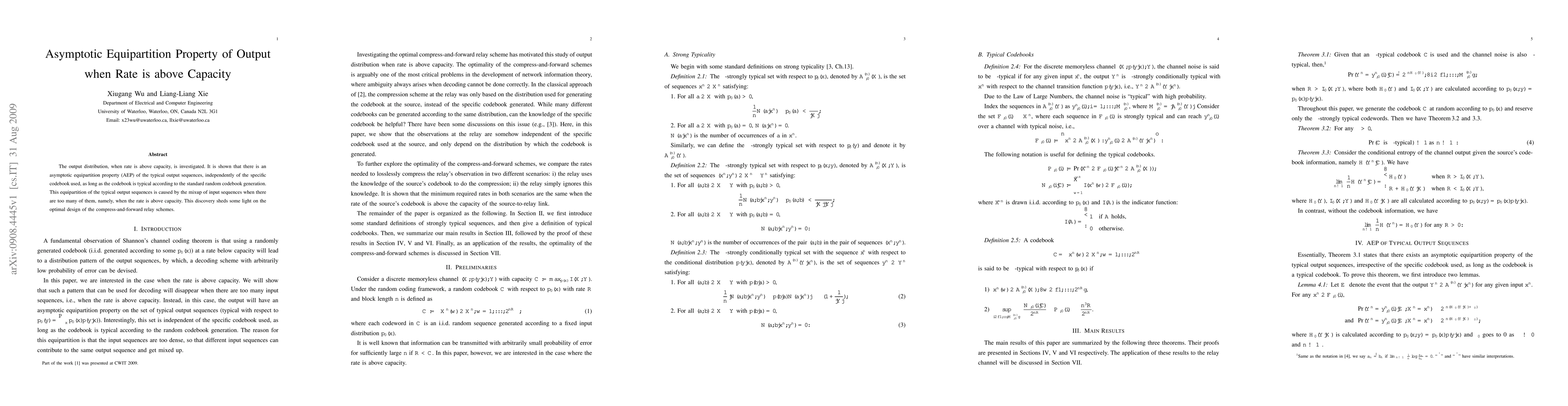 The output distribution, when rate is above capacity, is investigated. It is shown that there is an asymptotic equipartition property (AEP) of the typical output sequences, independently of the specific codebook used, as long as the codebook is typical according to the standard random codebook generation. This equipartition of the typical output sequences is caused by the mixup of input sequences when there are too many of them, namely, when the rate is above capacity. This discovery sheds some light on the optimal design of the compress-and-forward relay schemes.